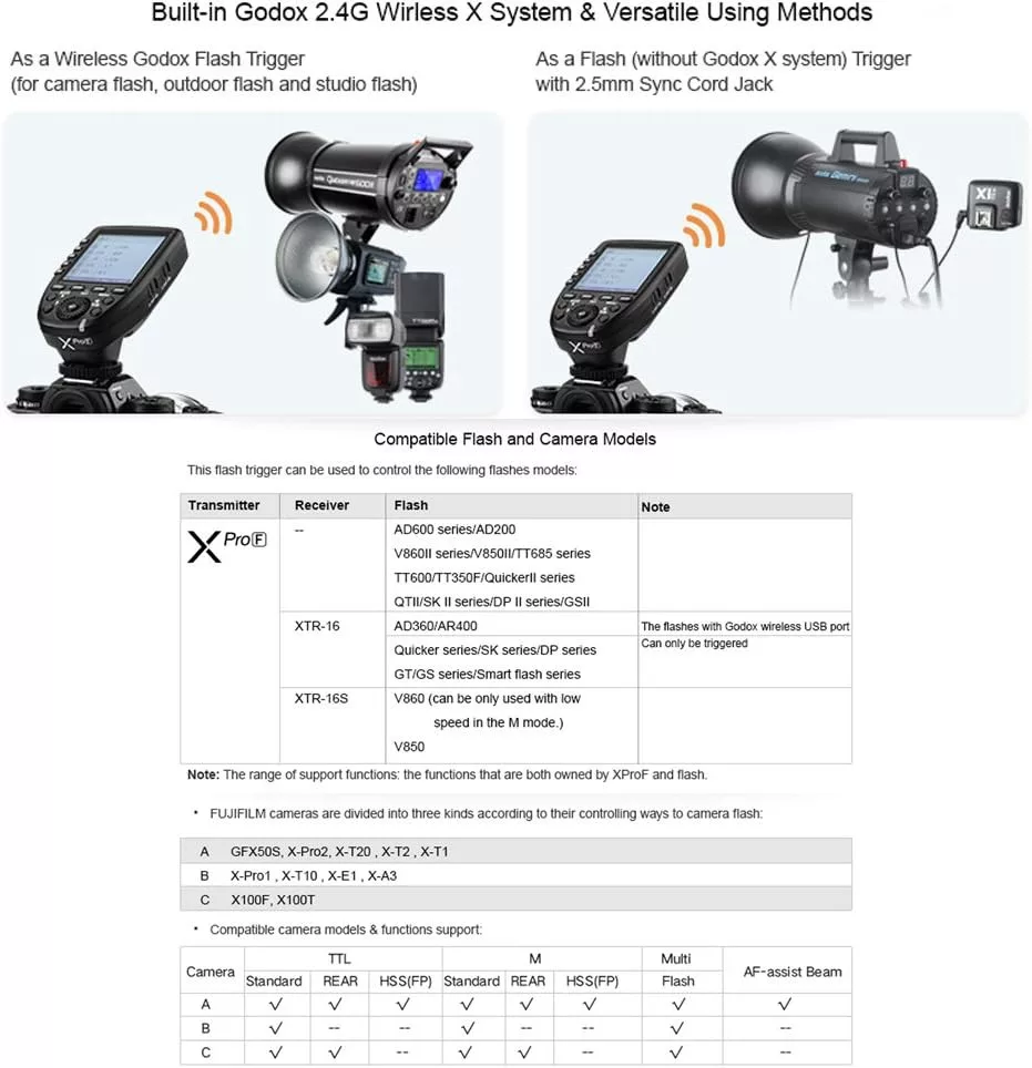 Godox Xpro-F TTL okidač pruža potpunu kompatibilnost sa serijom Fujifilm fotoaparata, uključujući modele GFX50S, X-Pro2, X-T20, X-T2, X-T1, X-Pro1, X-T10, X-E1, X-A3, X100F i X100T. Uređaj podržava originalne Fujifilm bljeskalice i druge bljeskalice kompatibilne s 2.4GHz bežičnim sustavom. 2.5mm sinkronizacijski priključak omogućuje korištenje s drugim fotoaparatima koji imaju PC sinkronizacijski priključak.