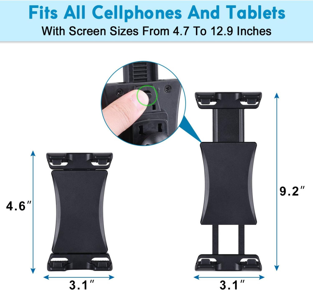 Specifikacije veličine: Držač je prikladan za uređaje s ekranom od 4,7 do 12,9 inča. Stezna ruka se proteže do maksimalno 9,25 inča, što ga čini idealnim za tablete od 7-12 inča.