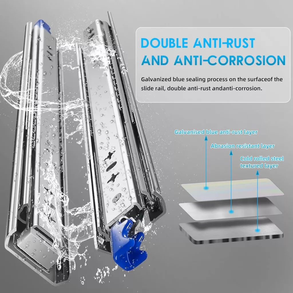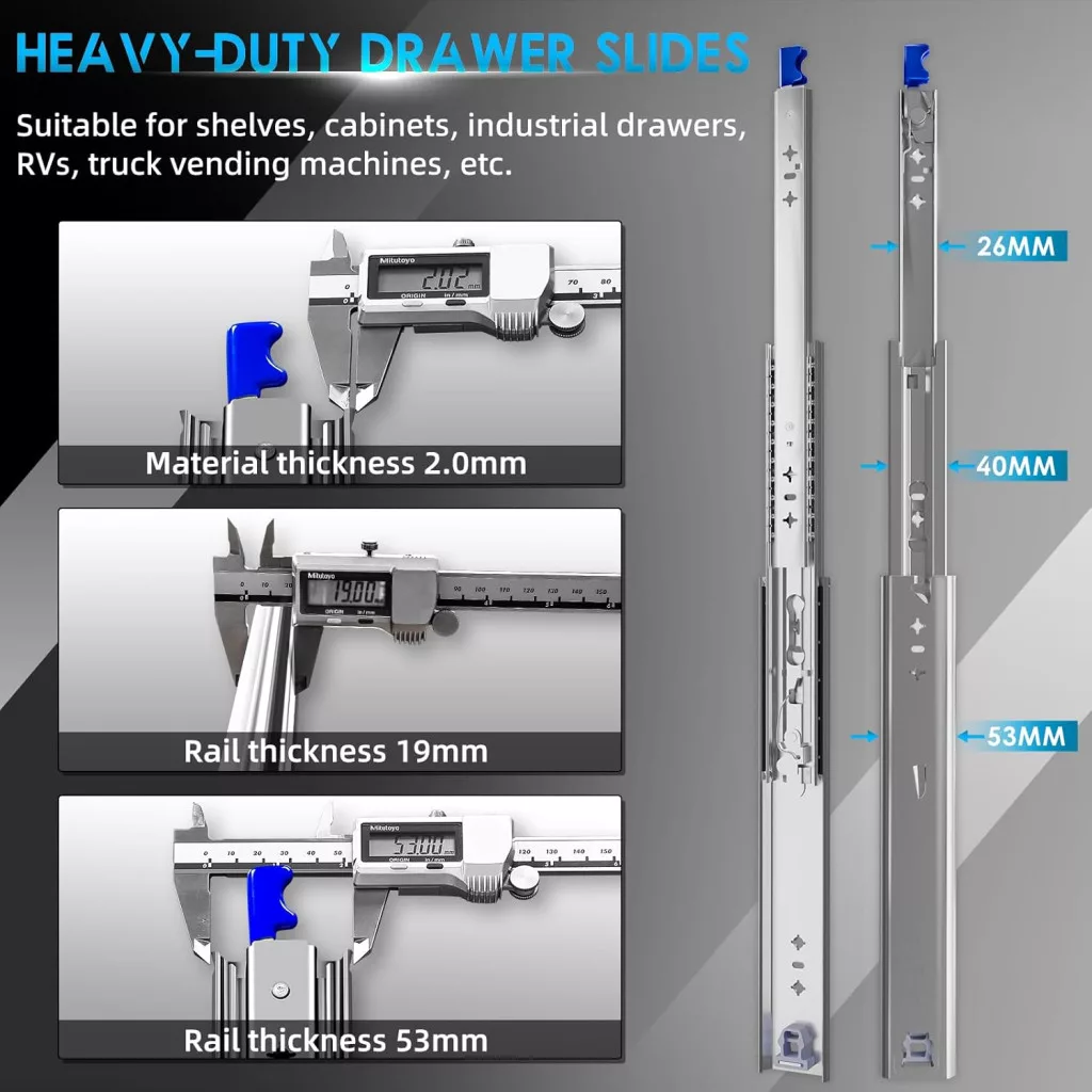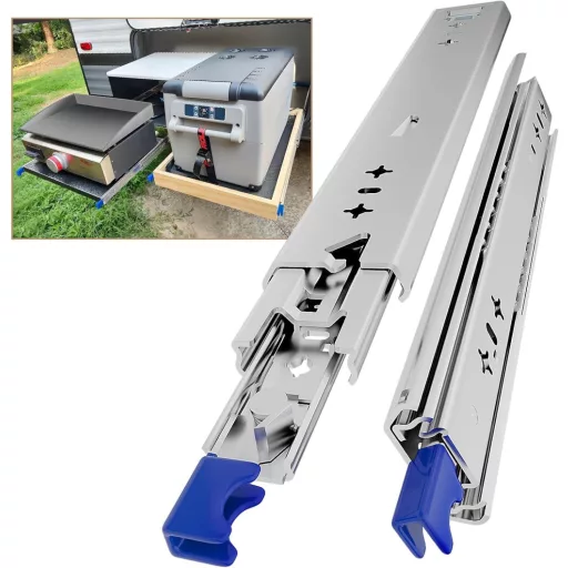 Ovaj profesionalni sustav vodilica za ladice za teška opterećenja posebno je dizajniran za zahtjevne primjene. Nosivost od 120 kg i funkcija punog izvlačenja osiguravaju pristup cijeloj dubini ladice. Integrirani mehanizam zaključavanja sprječava slučajno izvlačenje, što ga čini idealnim za industrijske, komercijalne i transportne primjene.