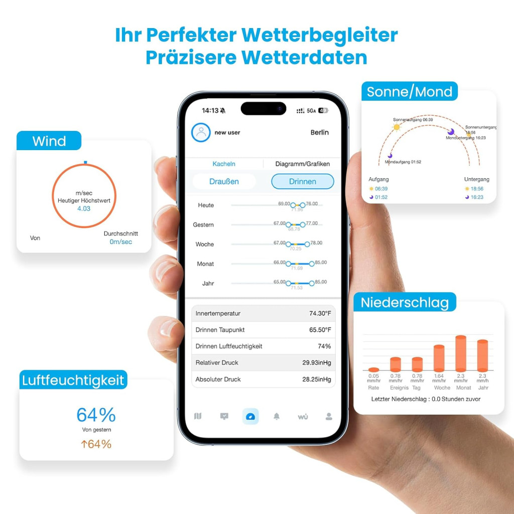 Stanica ima LCD zaslon koji je lako čitljiv, a koji prikazuje najvažnije podatke velikim slovima. Putem aplikacije Weatherseed možete primati trenutne obavijesti o kritičnim vremenskim promjenama i pristupiti cjelokupnoj 2-godišnjoj povijesti podataka.