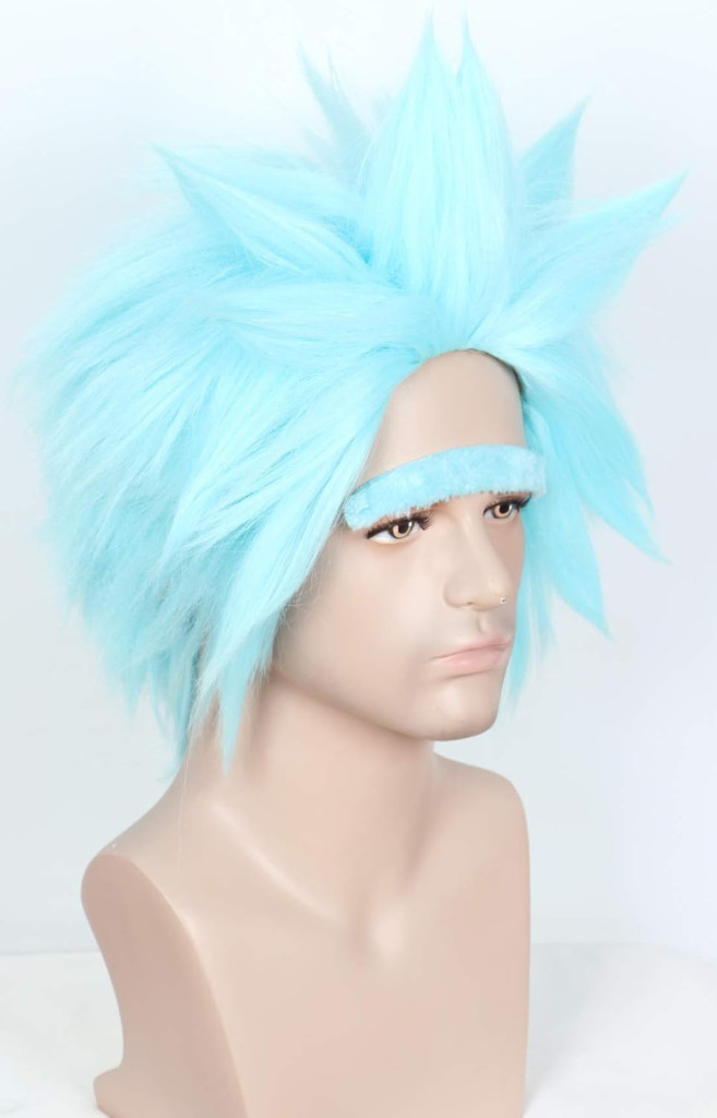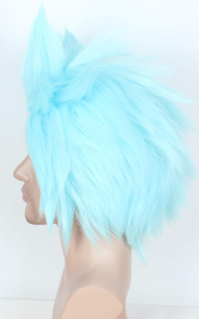 - Boja i dužina: Živahna plava boja, kratka perika duga oko 35 cm