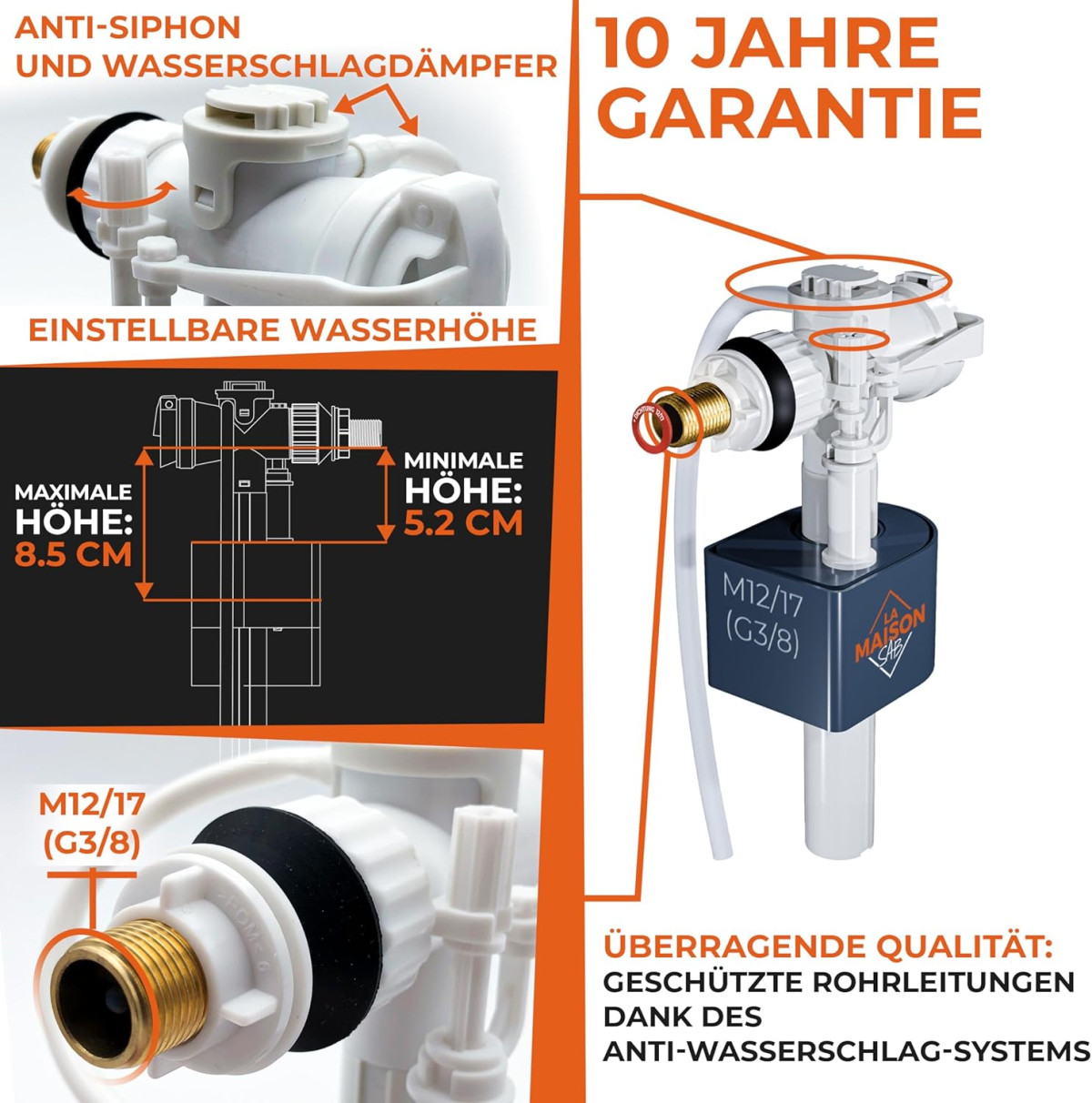 LA MAISON SAB Plovak - Ventil za punjenje vodokotlića, Horizontalna ugradnja, Štedljiv, Bijeli, CE certifikat, Jednostavna montaža, 21 Bar