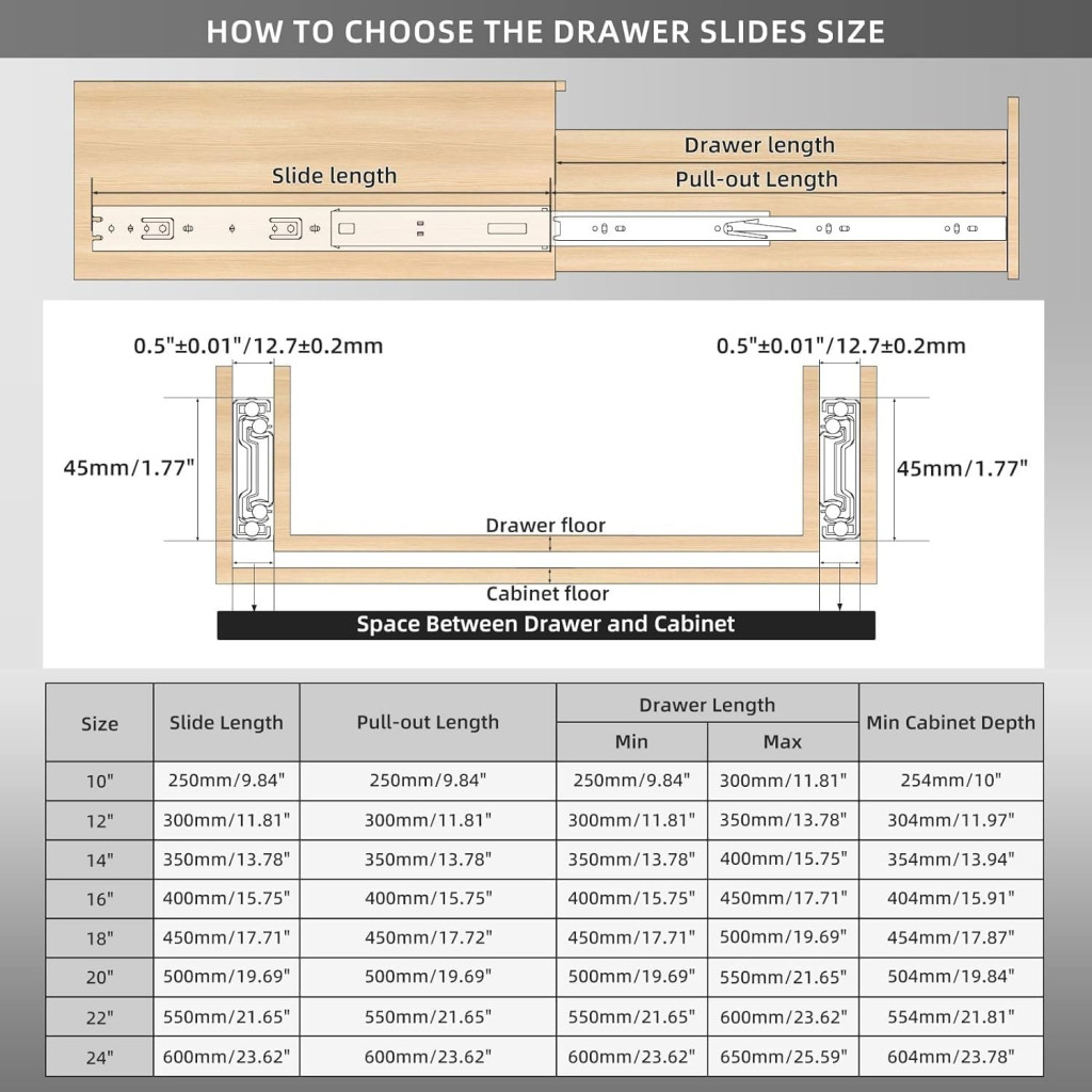A fiókcsúszó hosszának kiválasztásakor fontos figyelembe venni, hogy a sín hossza legyen kisebb vagy egyenlő a fiók hosszával. A 300 mm-es változat a legtöbb szabványos méretű fiókhoz ideális, de különböző méretű fiókokhoz érdemes a megfelelő hosszúságú változatot választani.
