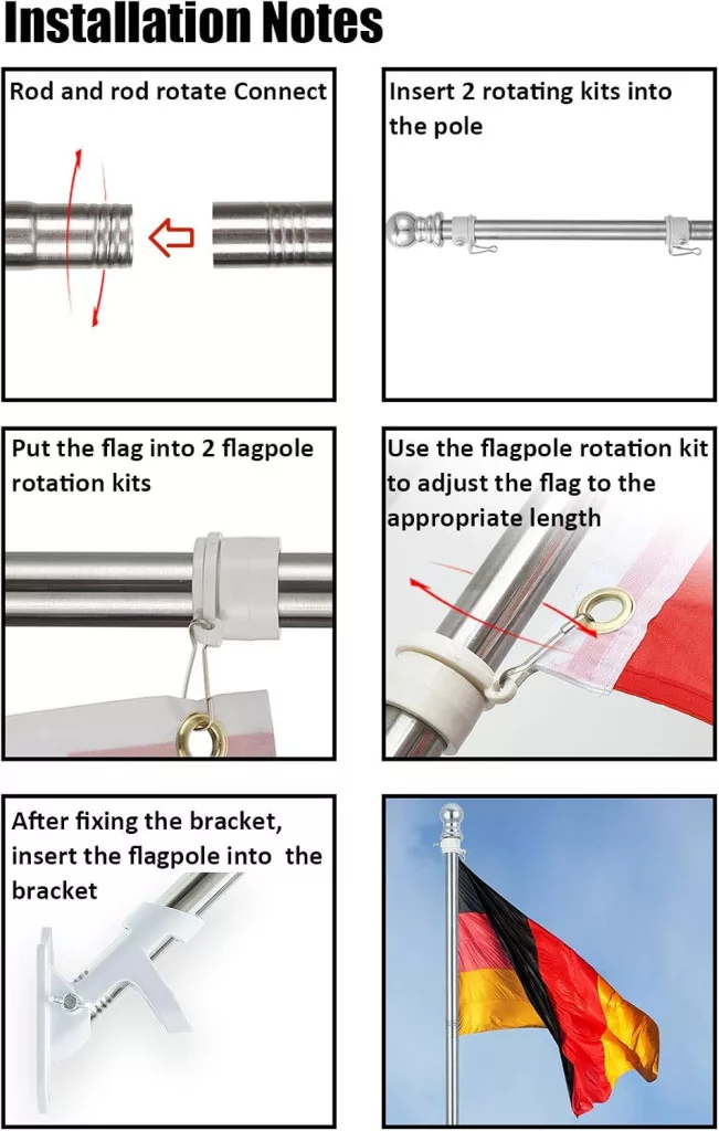 - Forgó gyűrűk: Két zászlógyűrű segítségével különböző méretű zászlókat rögzíthet, és a zászló nem csavarodott fel szél közben
