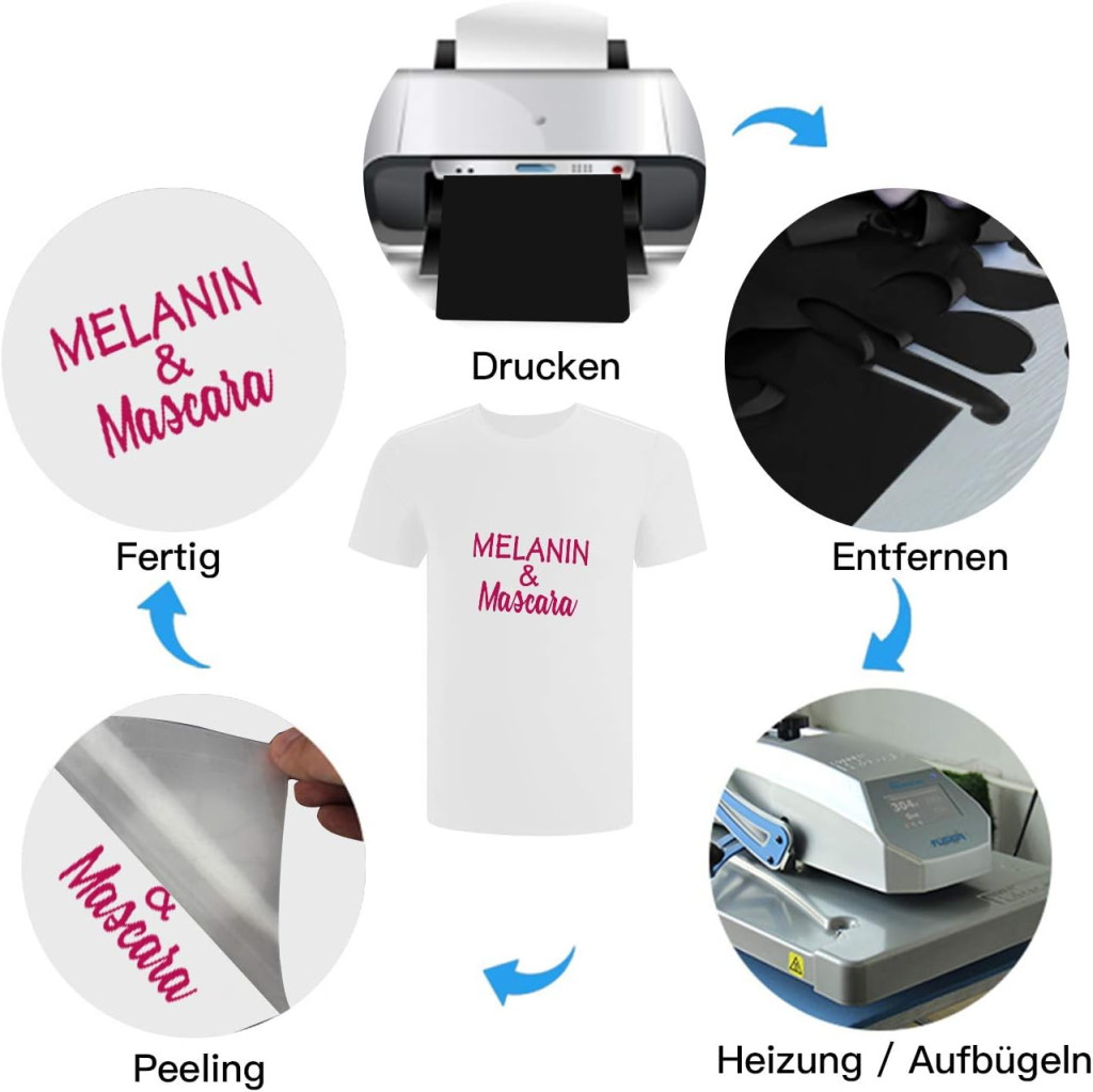 Primjena je jednostavna: izrežite željeni uzorak na svom uređaju, uklonite sitne dijelove pomoću prozirne podloge, zatim ga postavite na tekstil i pritisnite vrućom peglom ili toplinskom prešom.