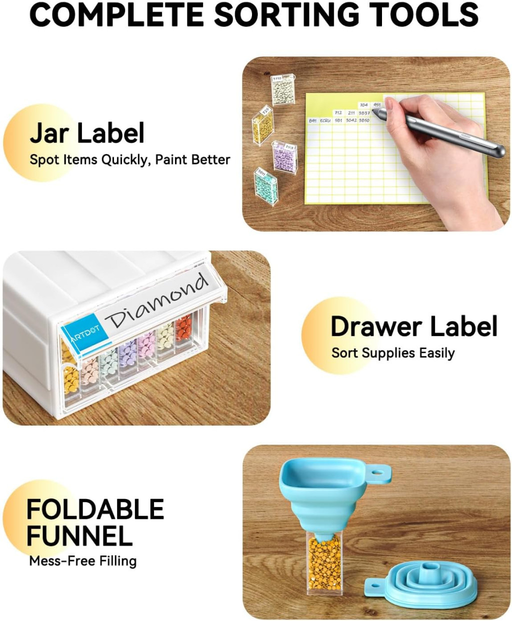 Az ARTDOT szett tartalmazza az összes szükséges kiegészítőt - címkéket, matricákat és egy összecsukható tölcsért, amely megkönnyíti a gyöngyök feltöltését és megelőzi a szóródást. Ez a gondolkodásmód a részletekről azt mutatja, hogy az ARTDOT valóban megérti a kézműves közösség szükségleteit.