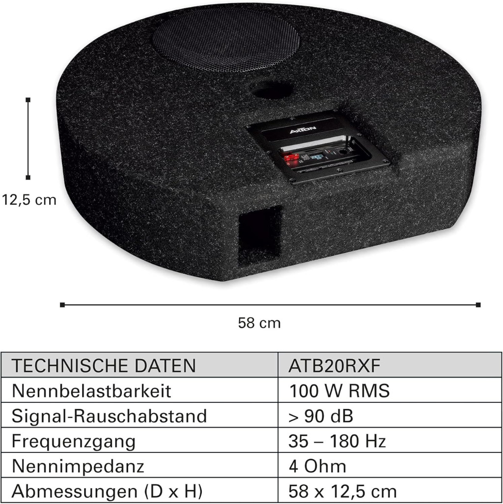 AXTON ATB20RXF kompatibilan je s gotovo svim modernim automobilima koji imaju rezervni kotač od 23 inča (58 cm). Visoko razinski ulazi subwoofera omogućuju izravno spajanje na tvornički radio, bez potrebe za REM izlazom. Funkcija Auto Turn-On automatski uključuje subwoofer kada se primi glazbeni signal.