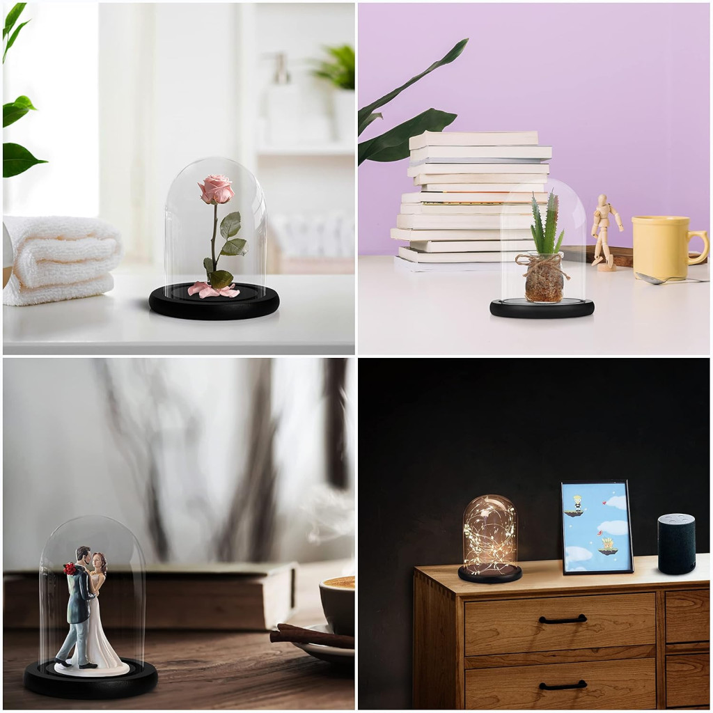 • Stabil fa alap: Az MDF alapú fekete fa talp speciális hornyokkal rendelkezik, amely biztosan rögzíti az üvegharangot és megakadályozza a mozgást
