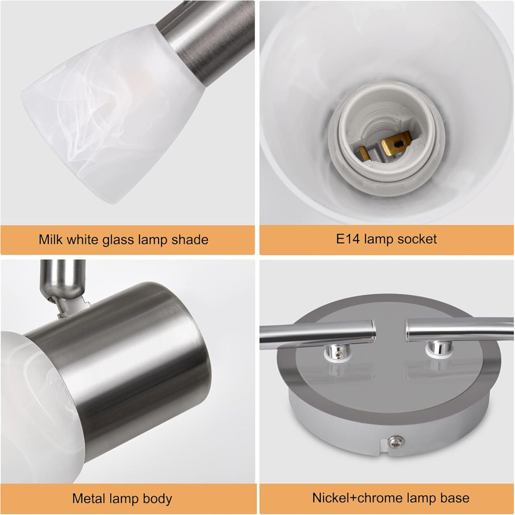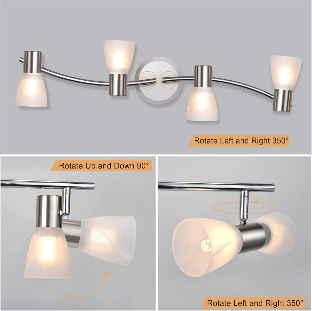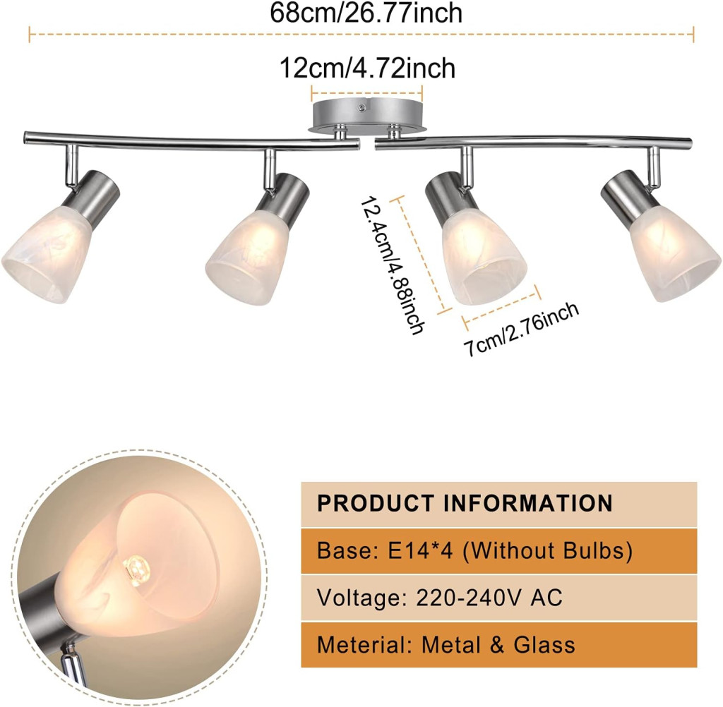 A csomag tartalmazza az 1 darab 4 izzós mennyezeti spotlámpa szerkezetet, 4 darab üveg lámpaernyőt, valamint a teljes szerelési anyagot és angol nyelvű szerelési útmutatót. Az elektromos szereléshez ajánlott szakember felkérése a biztonság érdekében.
