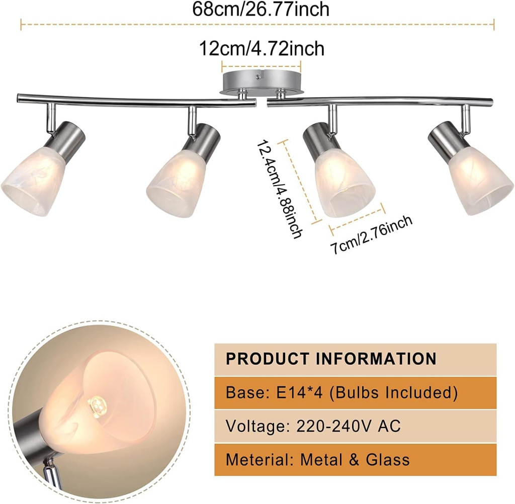 Az Unikcst 4 izzós mennyezeti lámpa kiváló választás azoknak, akik modern, stílusos megvilágítást keresnek, amely egyúttal praktikus és energiahatékony. Az üveg mintás lámpaernyő egyedi vizuális hatást hoz létre, míg a forgatható izzótartók lehetővé teszik a fény irányának teljes személyre szabását.