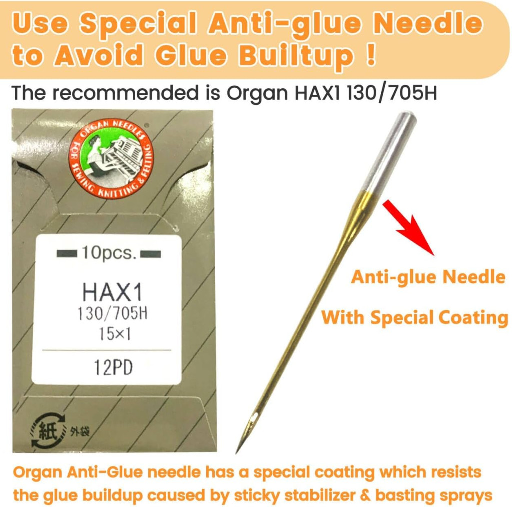 Sprječavanje lijepljenja igle: Smanjite brzinu stroja na 400 okretaja, koristite pomoćni materijal za šivaći stroj (Sewer's Aid) za iglu i redovito čistite iglu alkoholom. Igle protiv lijepljenja također su dobro rješenje.