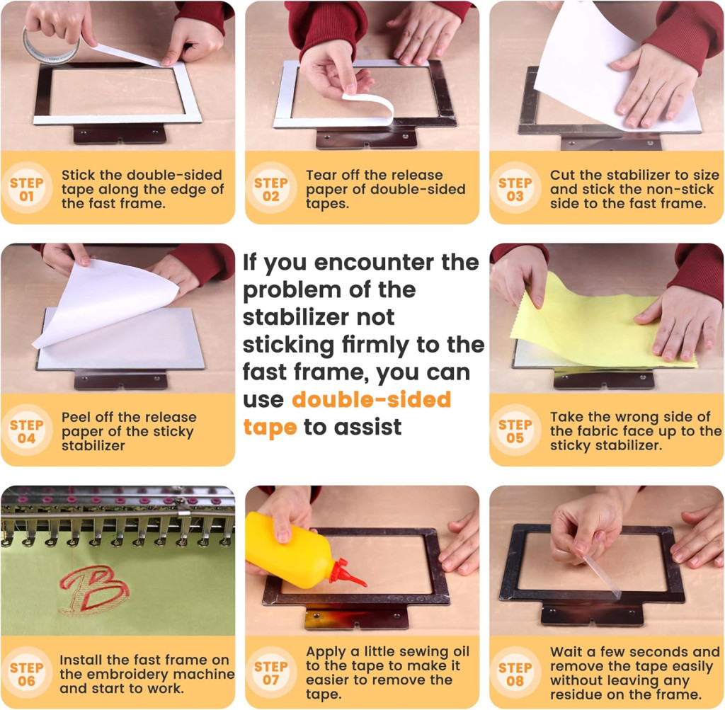 Ispravna primjena: Pritisnite materijal na samoljepljivu površinu, a zatim ga stavite u okvir za vezenje. Za gušće motive koristite dva sloja stabilizatora.
