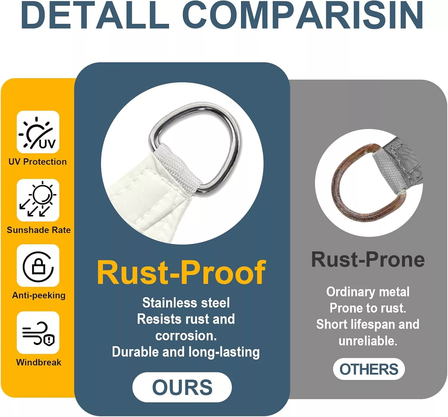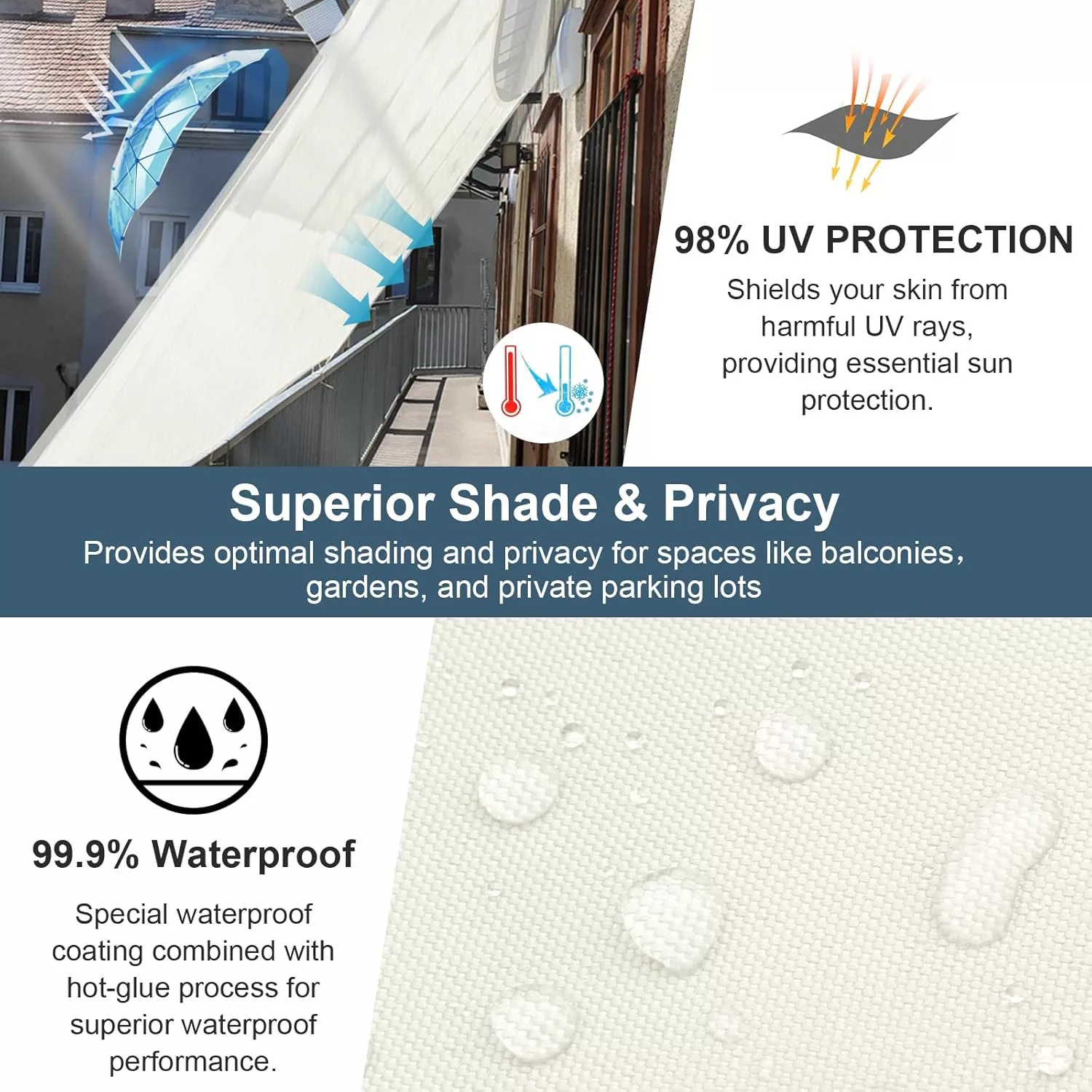 U usporedbi sa sličnim proizvodima, COOL AREA tenda za sunce ističe se svojom 99,9% vodootpornošću i 95% UV zaštitom, što je među najboljim vrijednostima u kategoriji. Ojačani kutovi i šavovi izrađeni s tehnologijom toplinskog zatvaranja dodatno povećavaju trajnost i pouzdanost proizvoda.