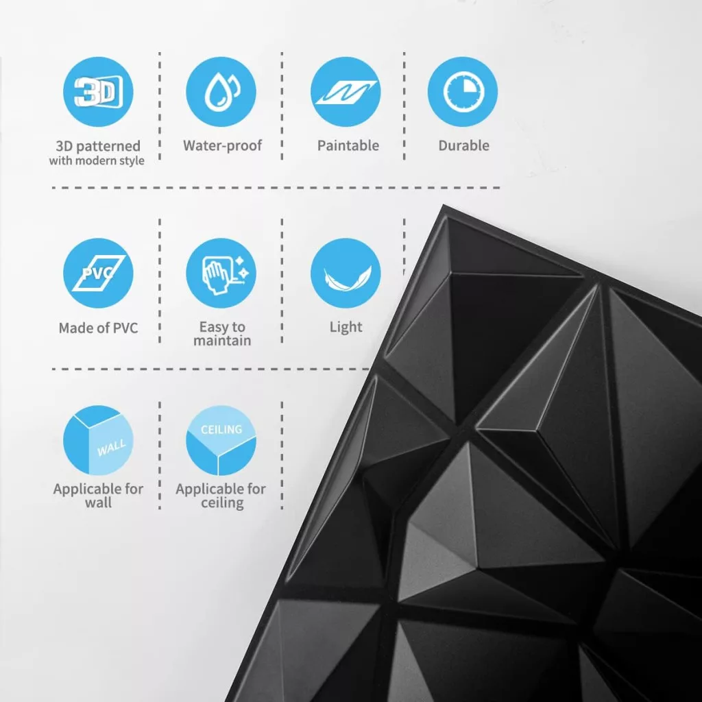 Art3d 3D Diamond Falburkolat Panelok - 30x30 cm, Matt Fekete, 33 darab