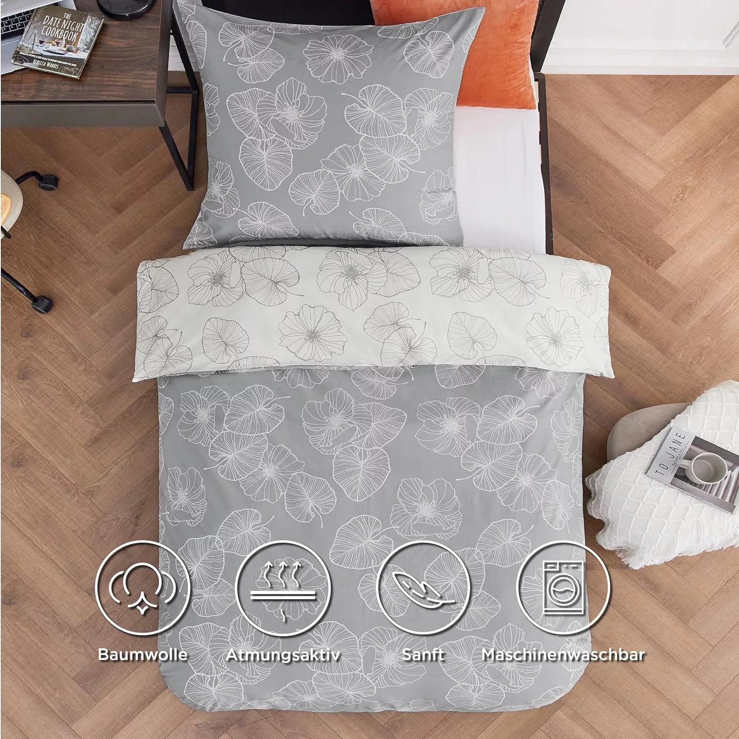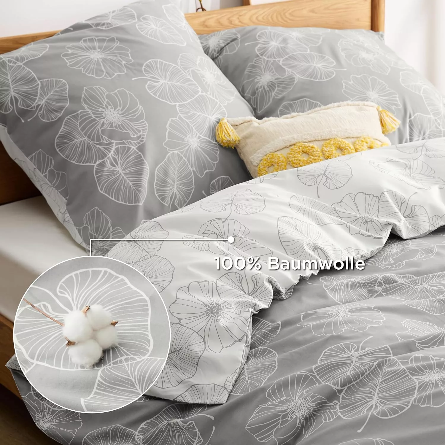 BEDSURE Pamučna Posteljina 135x200 cm Uzorak Ginkgo Siva 2 Dijelna S Jastučnicom