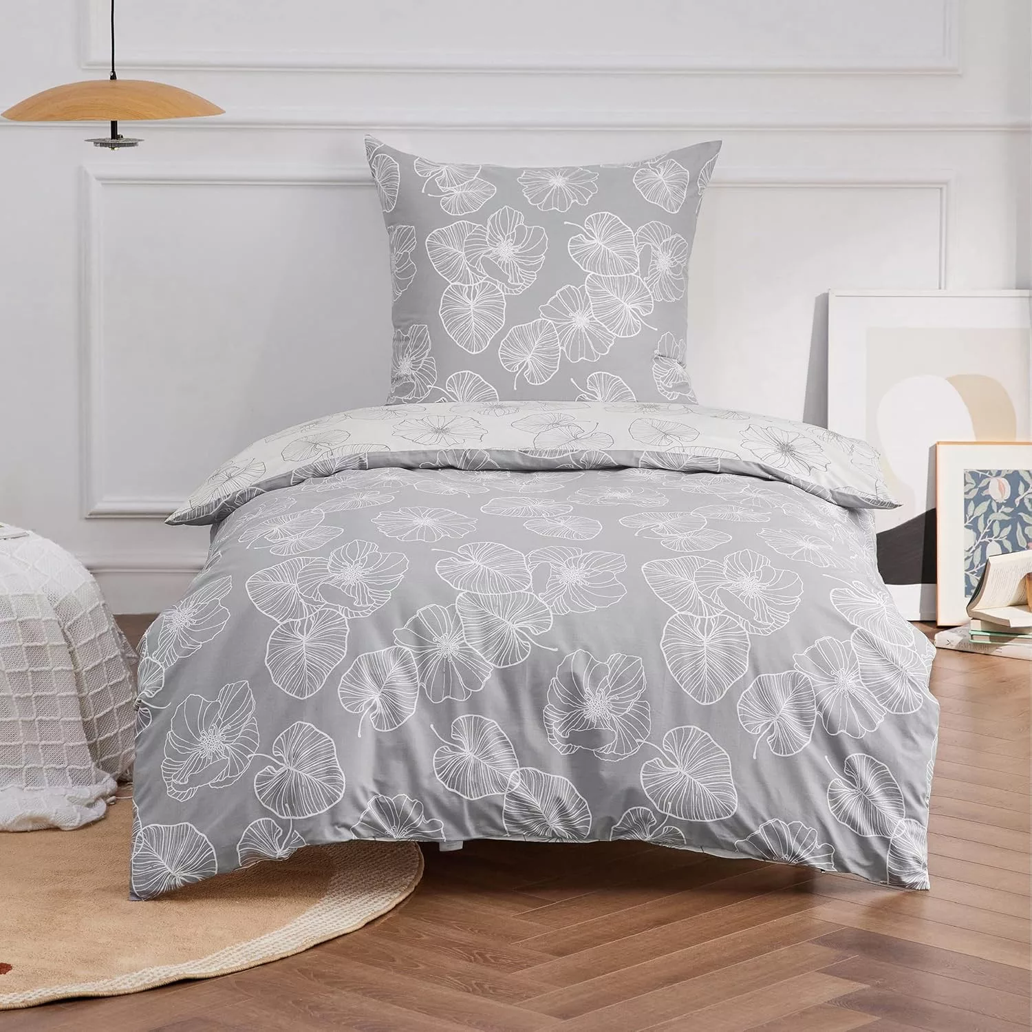 Dizajn sa sivim lišćem ginka daje krevetu moderan i elegantan izgled. Prednja i stražnja strana izrađene su u različitim, skladno usklađenim bojama, tako da jednostavno možete promijeniti atmosferu spavanja okretanjem posteljine. Zahvaljujući patentnom zatvaraču, navlaka se lako uklanja, a vezice u kutovima osiguravaju da poplun ostane na mjestu.