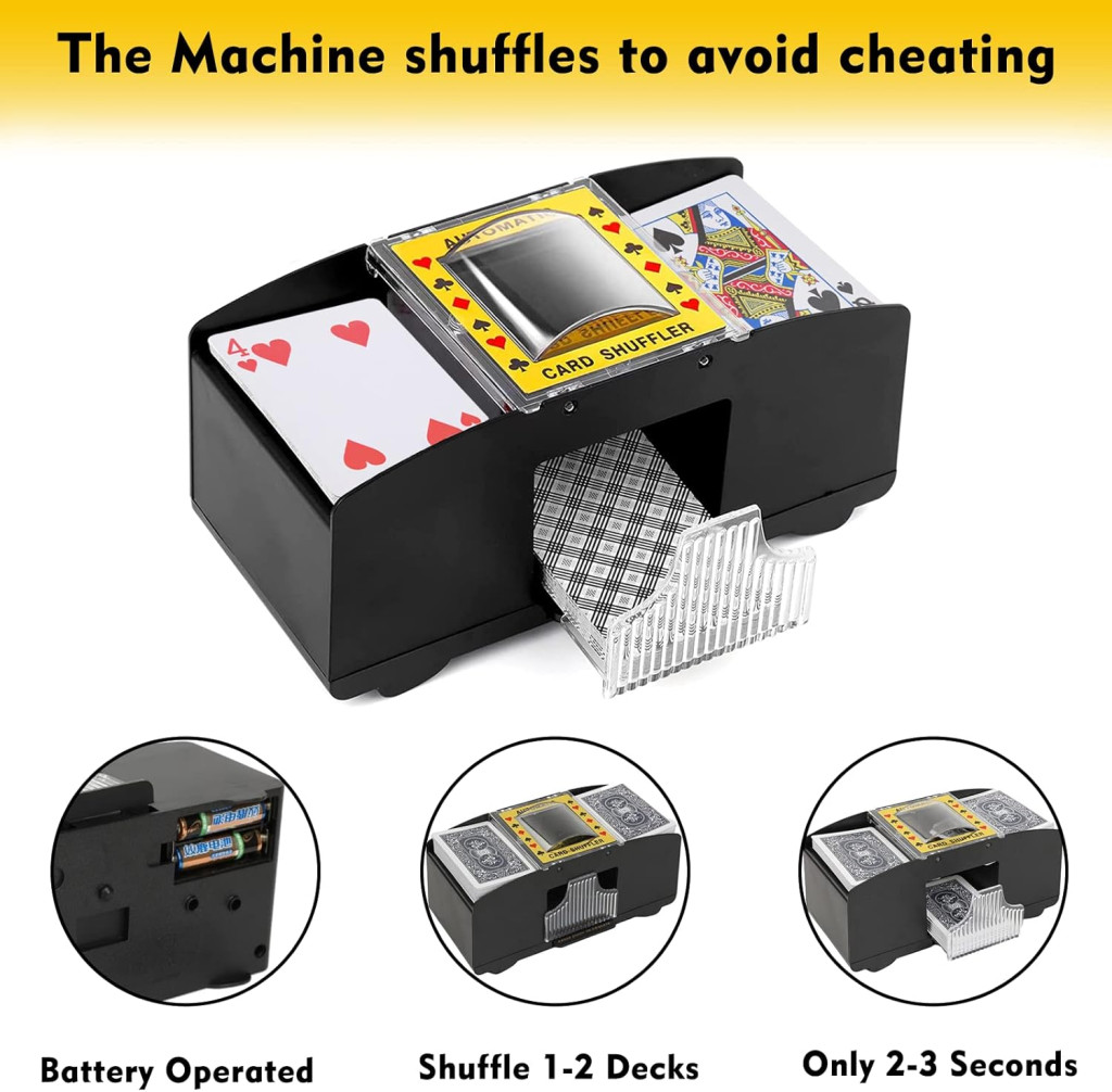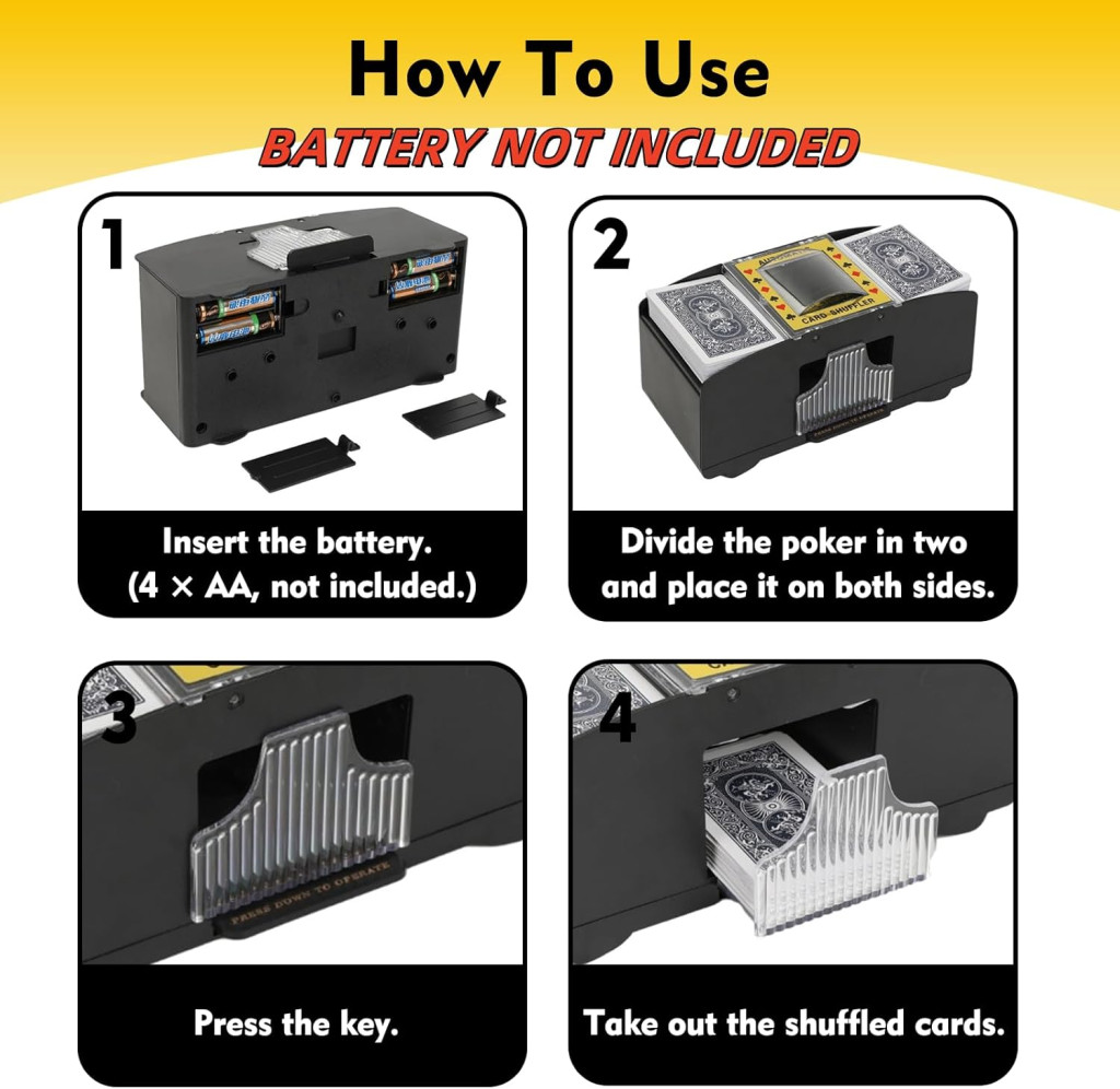 - Munjevito brzo miješanje: Radi na 4 AA baterije (nisu uključene) i miješa 2 špila karata u sekundi
