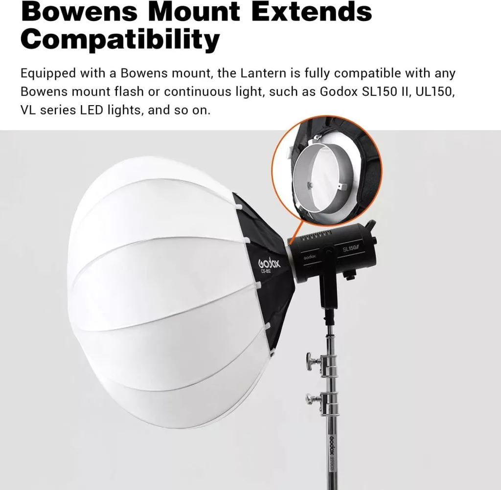 A Godox Lantern Softbox Bowens csatlakozással rendelkezik, amely az iparban széles körben használt szabvány. Ez azt jelenti, hogy kompatibilis a Godox SL-60W, SL150W II, FV150, AD300PRO, AD400PRO, AD600BM, VL150 és VL300 fényforrásokkal. A forgó gyűrű hüvelykujj csavarral rögzíthető, amely biztosítja a stabil és biztonságos csatlakozást. A softbox gyorsan felszerelhető és eltávolítható, így könnyű a fényforrások közötti váltás.