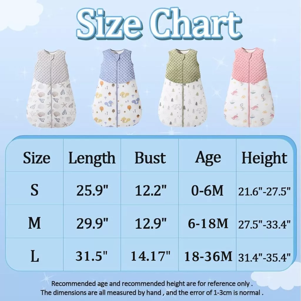Az L méretű alvózsák nagyobb csecsemőknek és kisgyermekeknek ajánlott. A Fairy Baby különböző TOG-értékekben érhető el (1.0, 1.5, 2.5-3.5), így kiválaszthatja a megfelelő vastagságot az évszaknak és a szobahőmérsékletnek megfelelően. A 1.5 TOG-os verzió tavaszi, őszi és mérsékelt téli hőmérsékletekhez ideális.