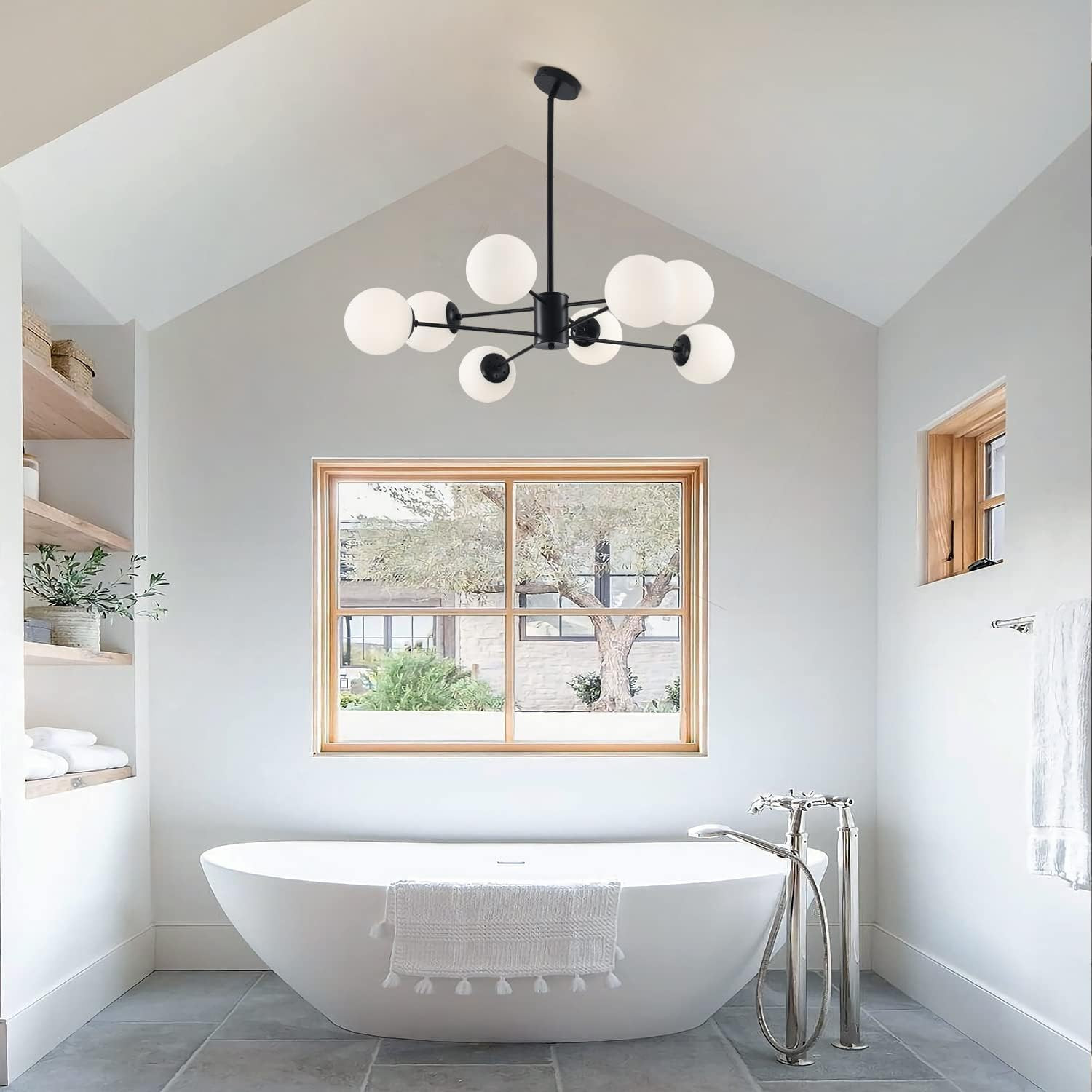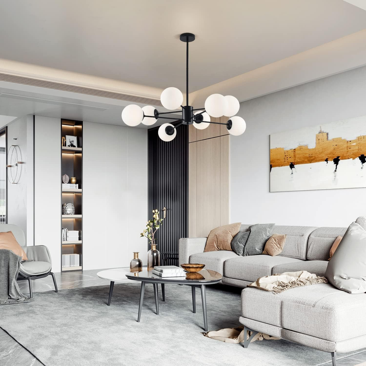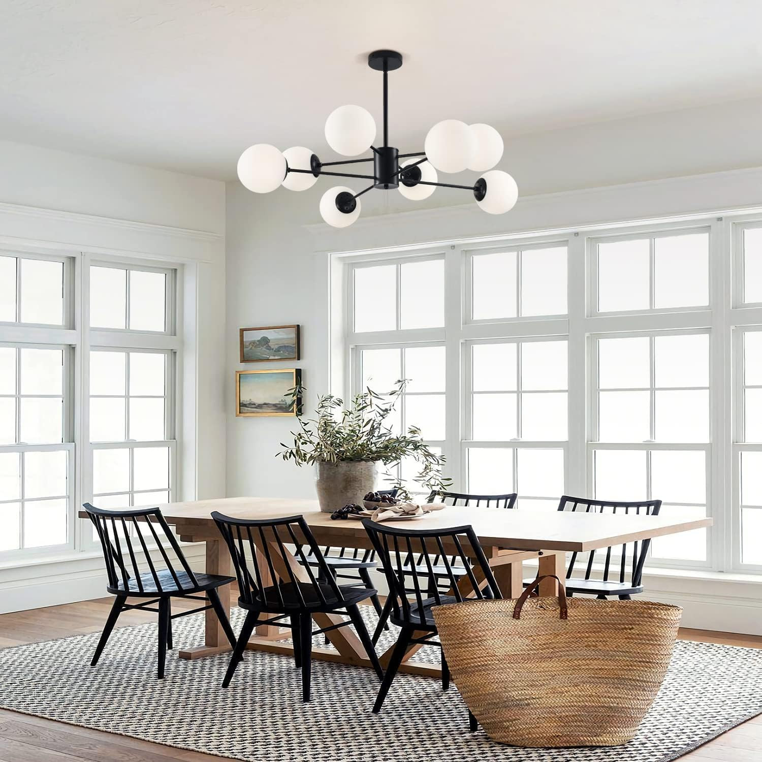 A KCO Lighting Black Sputnik Chandelier egy ikonikus mid-century modern csillár, amely elegáns stílust és funkcionális megvilágítást egyesít. Az 8 izzós kialakítás tökéletes fényt biztosít a konyhapultok, étkezőasztalok és nappali terek számára. A fekete és fehér színkombináció, valamint az üveggolyó diffúzorok romantikus és meleg fényt sugároznak, amely meghívó légkört teremt bármely szobában.