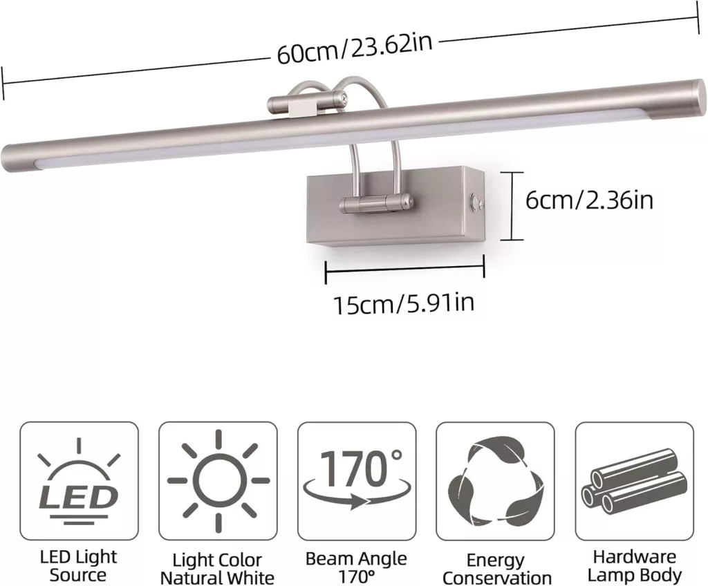 Inteligentno upravljanje dodirom omogućuje jednostavno podešavanje svjetline i temperature boje. Bilo da je koristite za šminkanje ili za općenitu rasvjetu kupaonice, ova svjetiljka zadovoljava sve potrebe. Glava rotirajuća za 270 stupnjeva i ruka od 170 stupnjeva osiguravaju optimalan kut osvjetljenja.