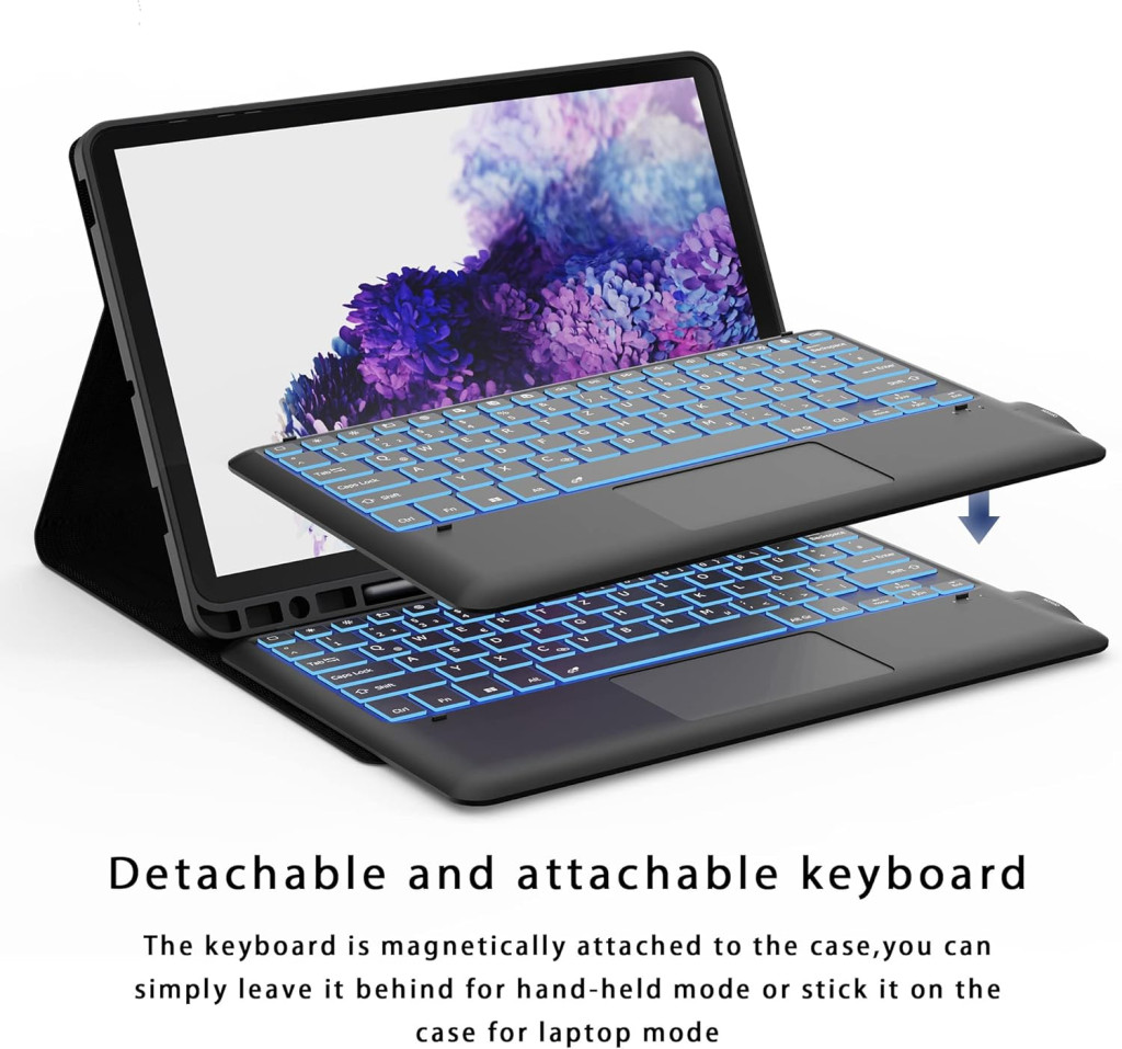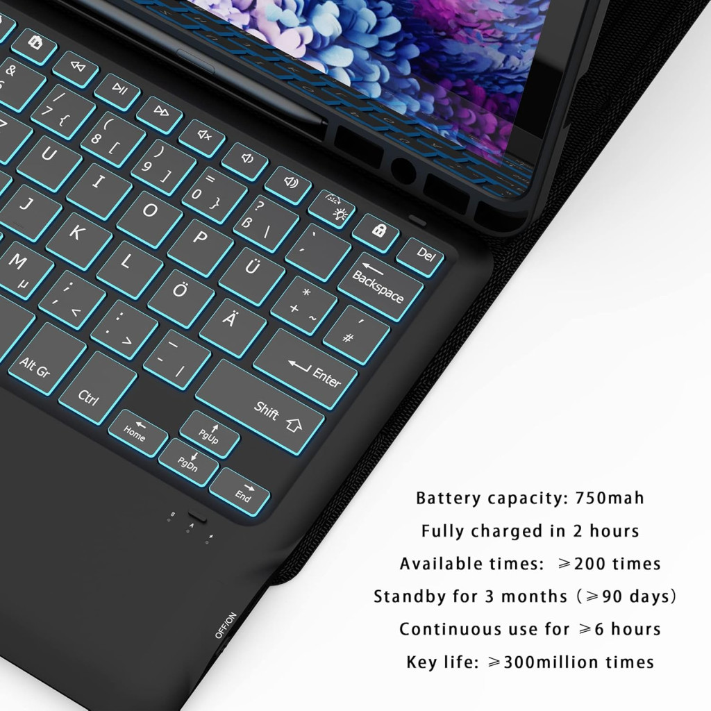 A termék német QWERTZ billentyűzet elrendezéssel rendelkezik, 7 szín LED háttérvilágítással és precíz érintőpaddal, amely lehetővé teszi a hatékony navigációt és dokumentumszerkesztést. A prémium PU bőr és TPU belső héj teljes védelmet nyújt a tabletnek, míg a vízálló kialakítás biztosítja a mindennapi használat során szerzett sérülésektől való védelmét.