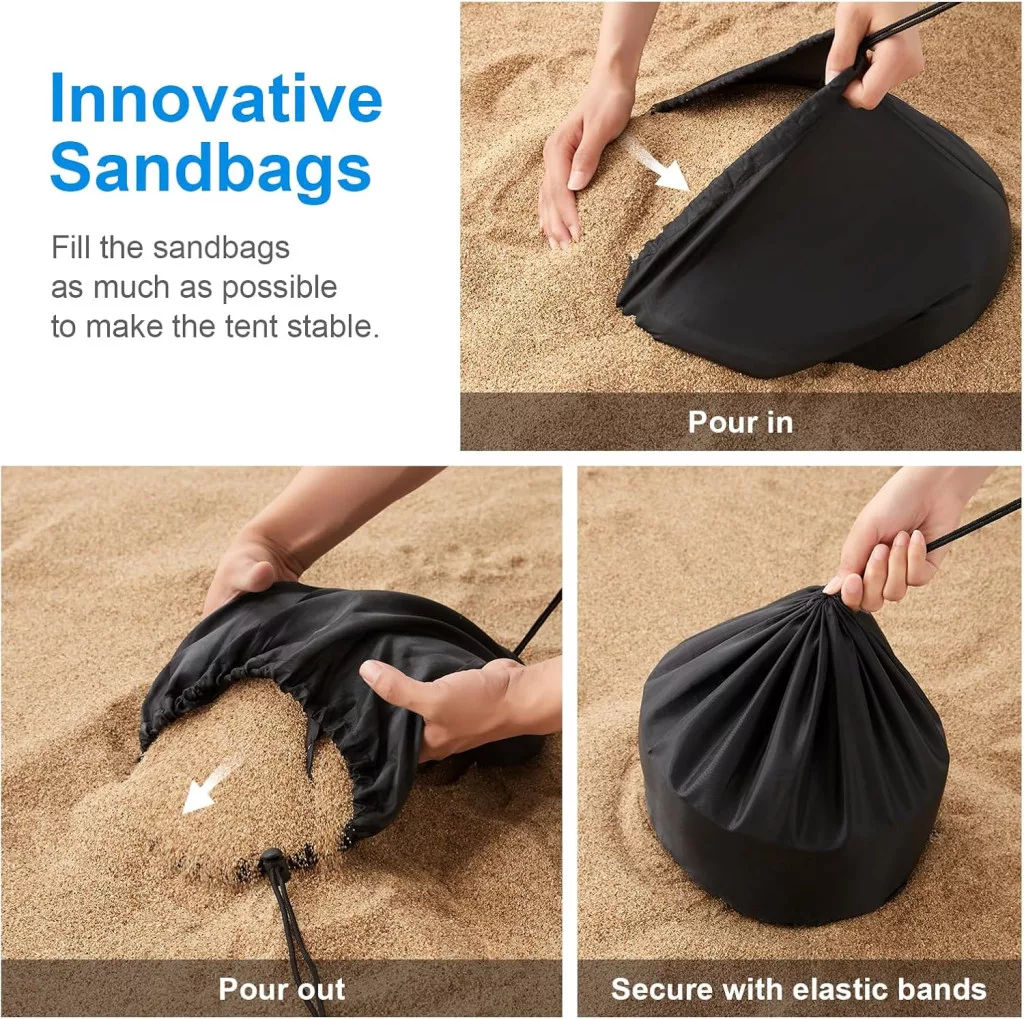 • Homokos talaj: A speciális homokrögzítő rendszer kifejezetten a homokos talajra lett tervezve, ahol a hagyományos sátorcövekek nem hatékonyak. A homokzsákok gyorsan megtölthetők és kiüríthetők.