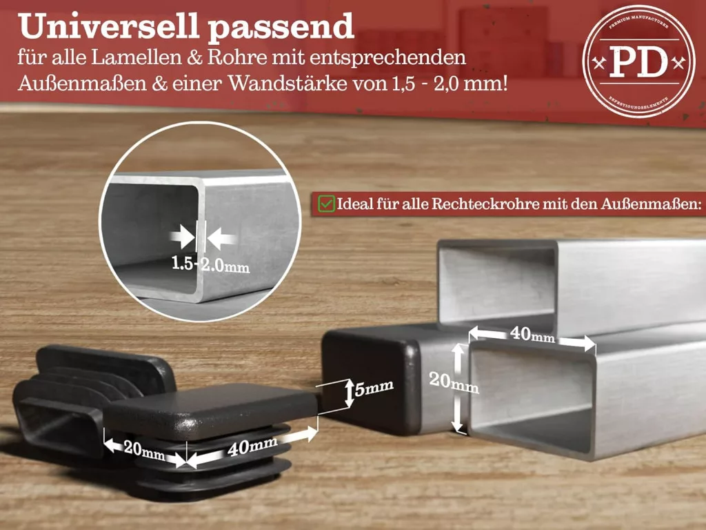 - Savršeno pristajanje: Dizajnirani posebno za kvadratne cijevi vanjskog promjera 40 x 20 mm, optimalno za debljinu stijenke od 1,5-2,0 mm.