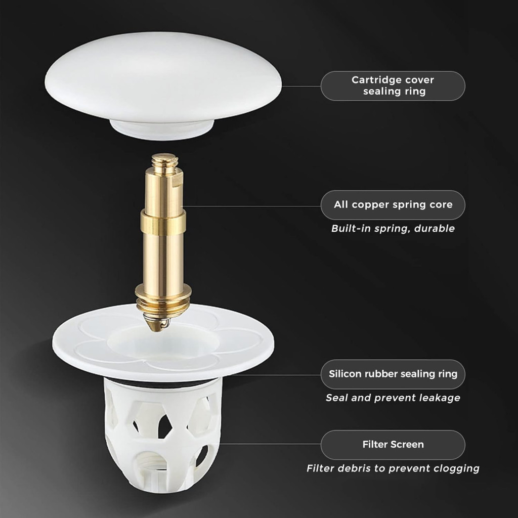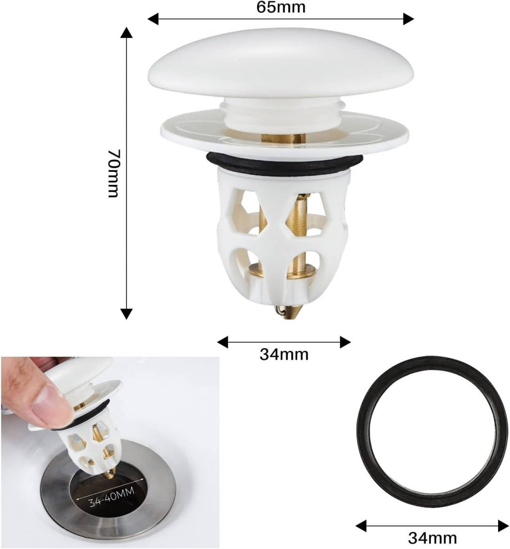 Tesyeux keramički čep za odvod revolucionira rad tradicionalnih čepova za odvod. Ovaj paket od 2 komada nudi elegantno rješenje za zatvaranje odvoda sudopera, umivaonika i kada. Aktiviranje čepa pritiskom na gumb osigurava jednostavnu uporabu, dok ugrađena košarica filtra sprječava ulazak dlačica i nečistoća u odvod, te štiti vrijedan nakit od ispadanja u odvod. Kombinacija keramičkog poklopca i mesingane jezgre osigurava ne samo moderan izgled, već i trajnost. Višeslojni brtveni prsten jamči savršeno prianjanje odvodima unutarnjeg promjera 34-40 mm, pružajući tako univerzalno rješenje za većinu kućanskih potreba.