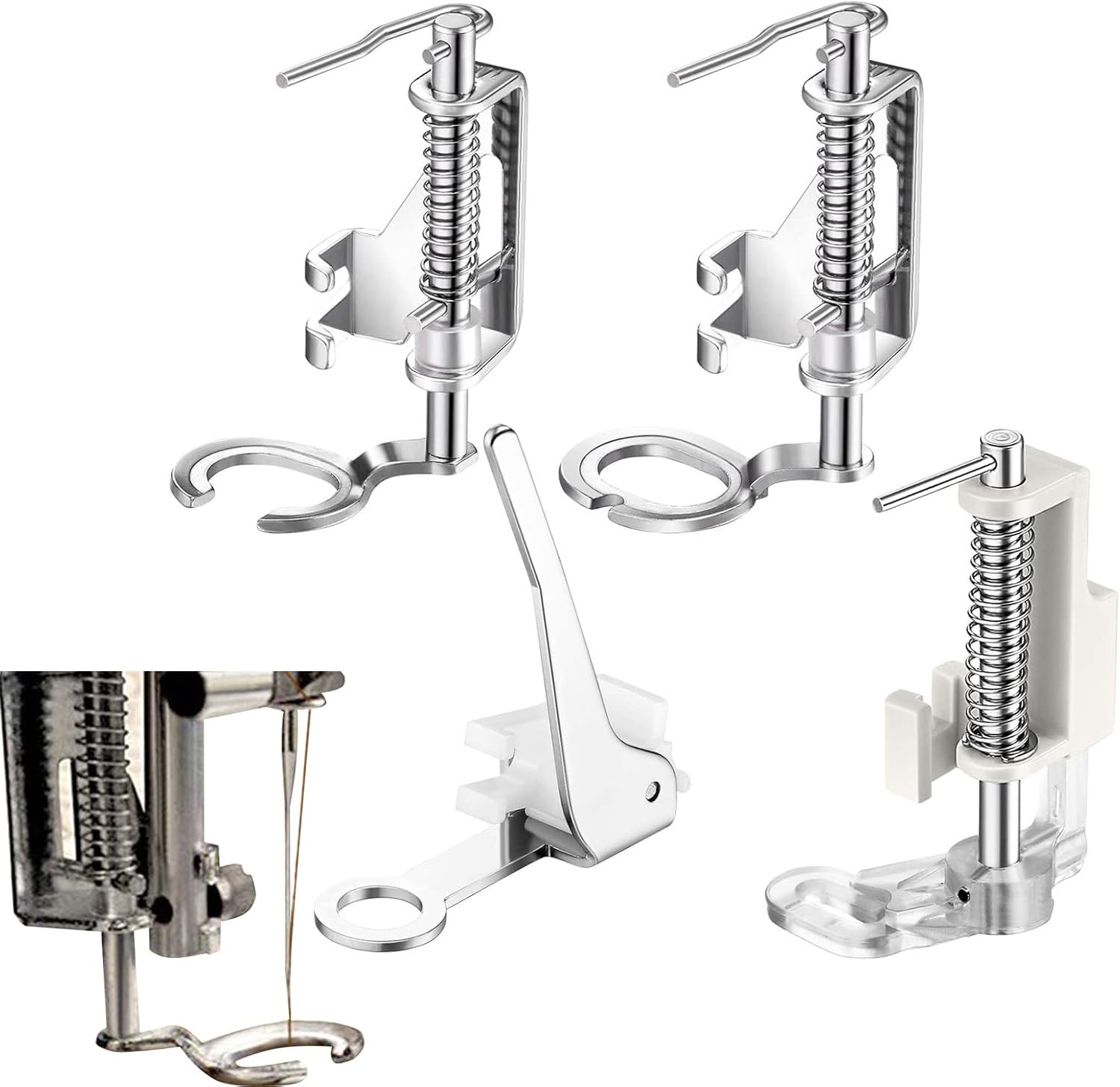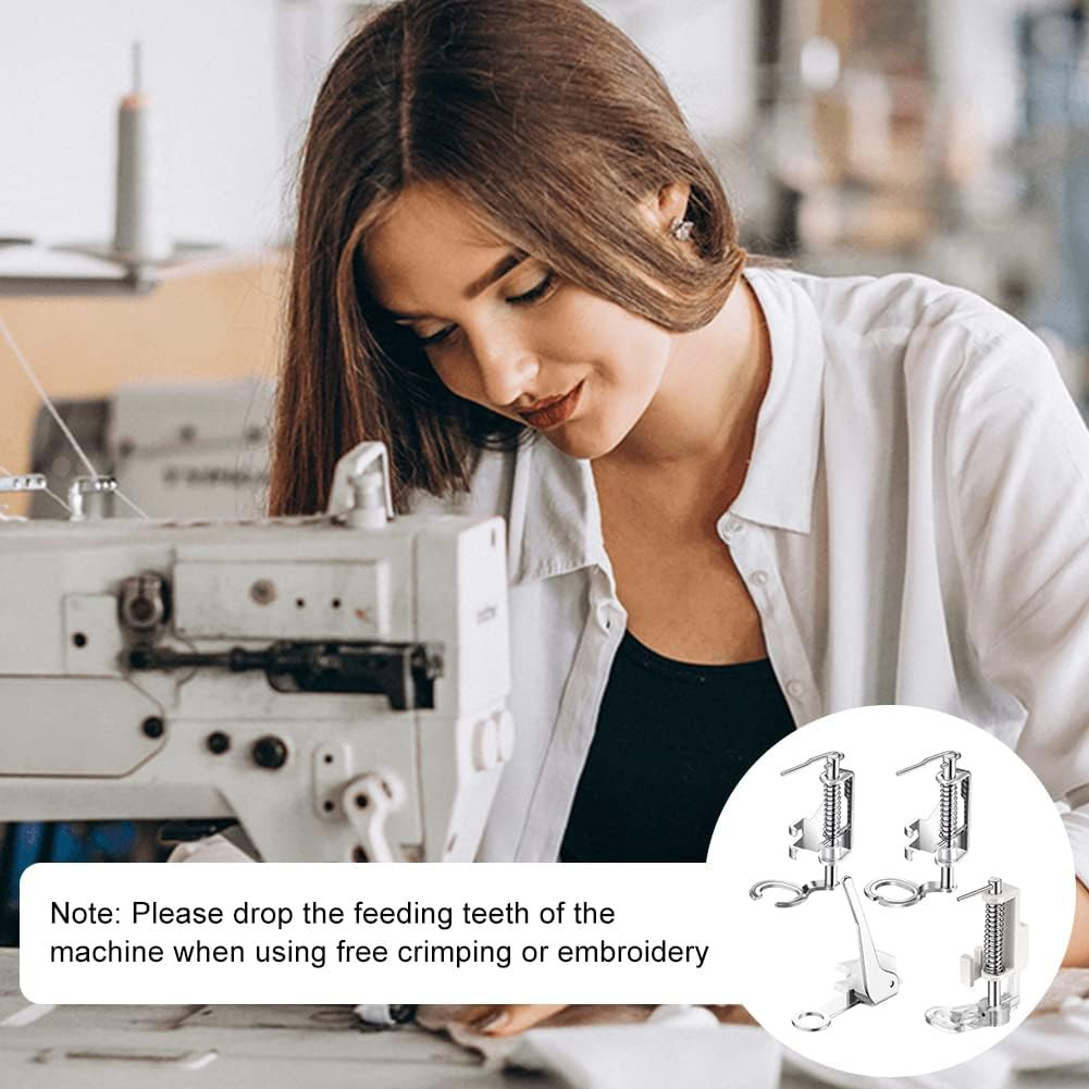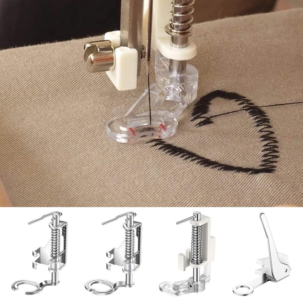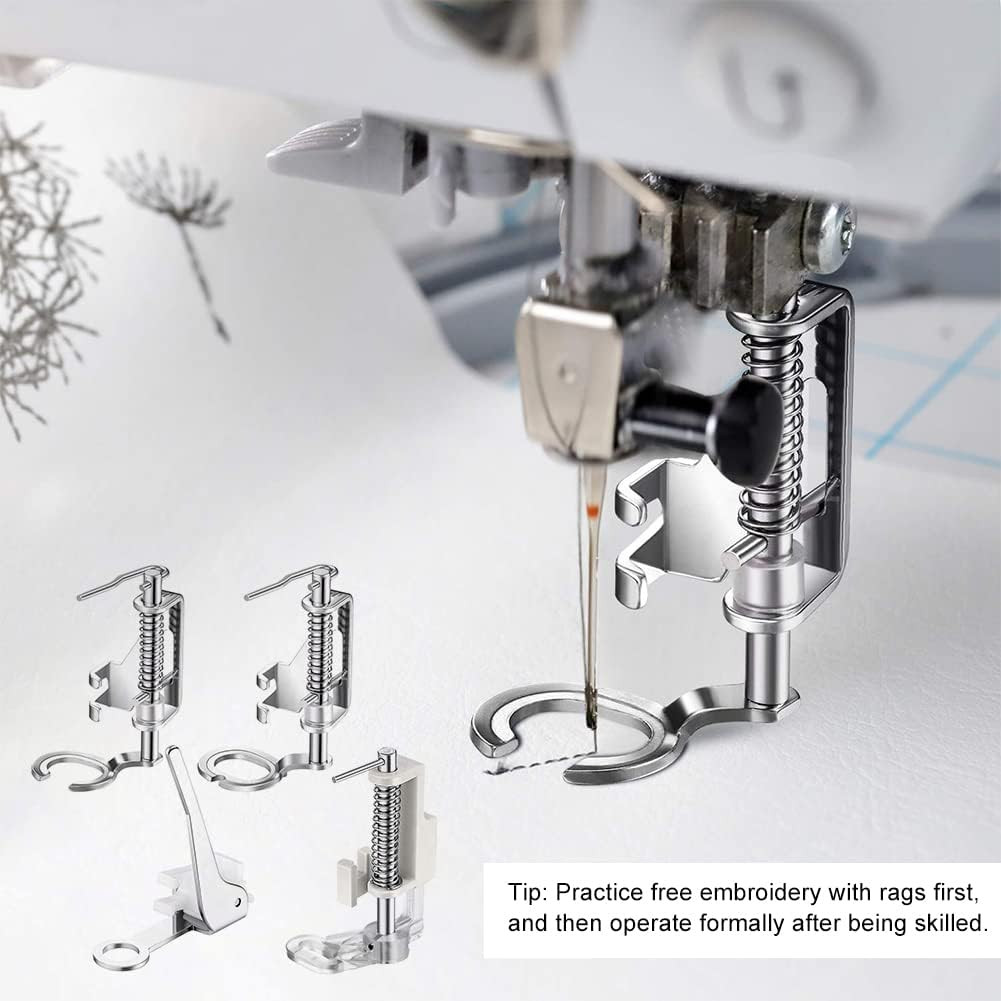 Ovaj set vrhunskih stopica za šivaći stroj razvijen je za slobodno šivanje i vezenje. Metalni set od 4 komada sadrži različite stopice koje su savršene za quilting, vezenje i normalno šivanje. Stopice su izrađene od nehrđajućeg čelika i ABS materijala, što osigurava dugi vijek trajanja i kompatibilne su s većinom kućnih šivaćih strojeva.