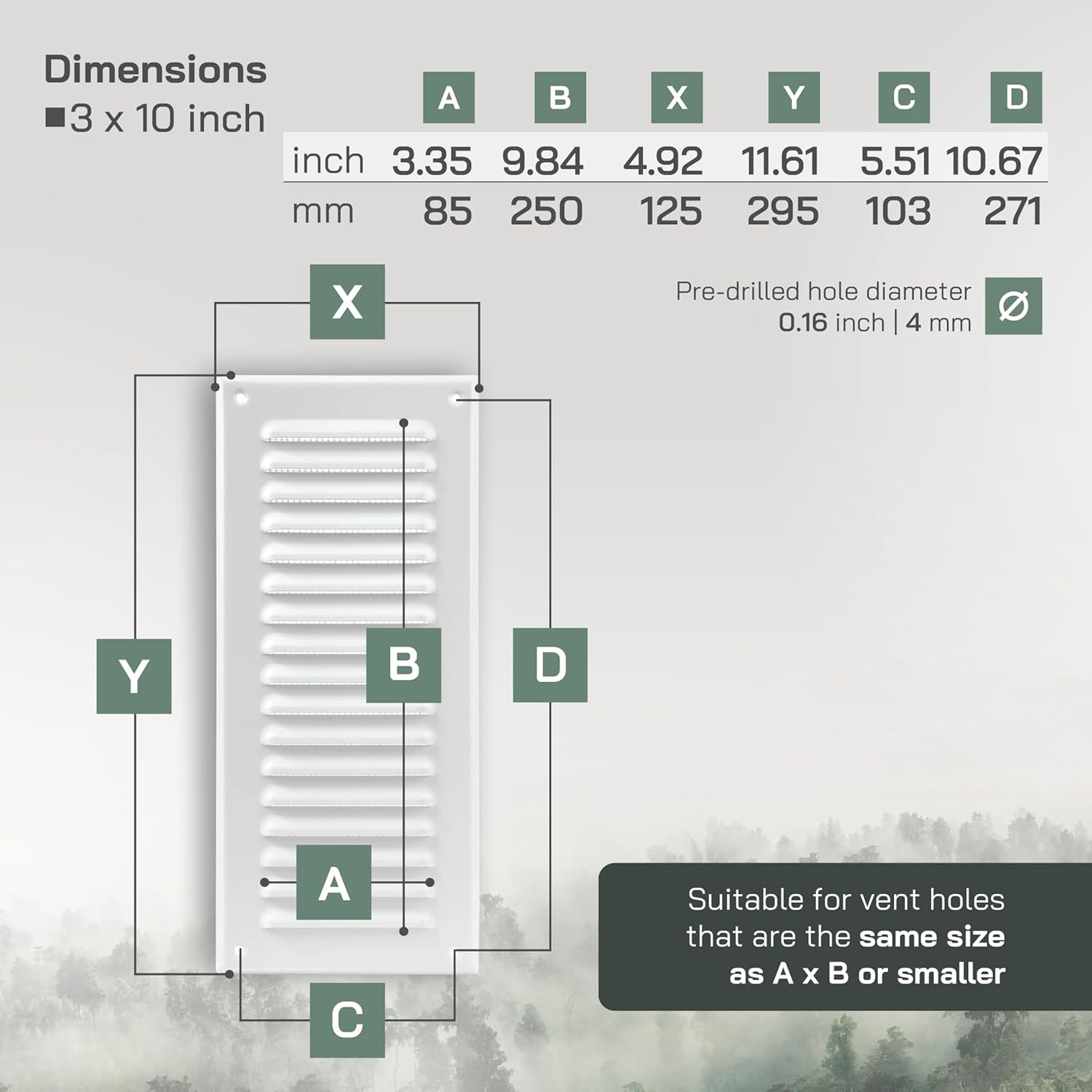 Méret és Kompatibilitás 125 x 295 mm külső mérettel, 85 x 250 mm-es szellőzési nyíláshoz tökéletesen illeszkedik. Csavarlukak távolsága: 140 x 271 mm.