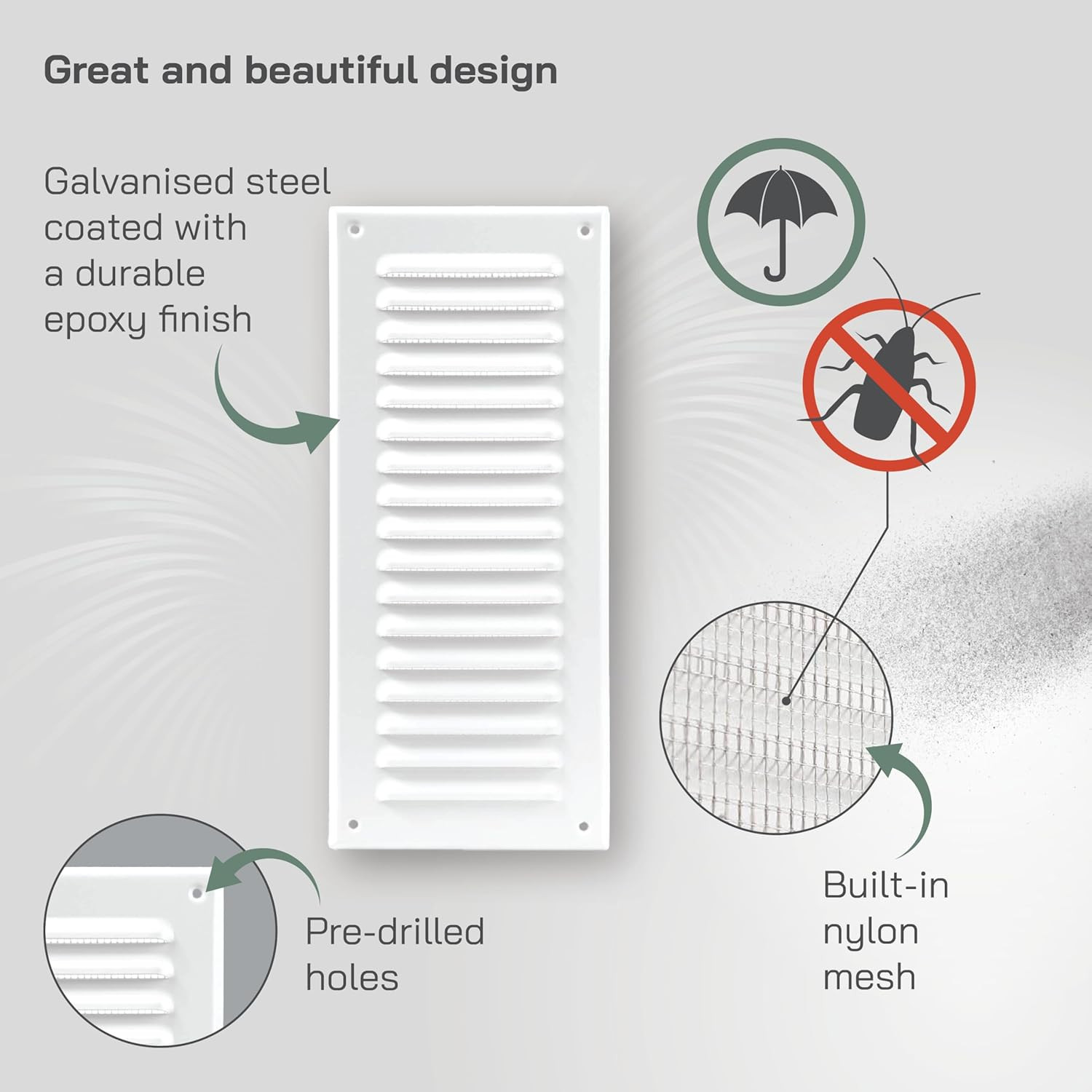 A Vent Systems 125 x 295 mm-es szellőzési fedél a tökéletes választás azok számára, akik megbízható, hosszú élettartamú és költséghatékony szellőzési megoldást keresnek. A galvanizált acél és epoxigyanta bevonat garantálja a korróziós ellenállást és a hosszú élettartamot. A beépített nylon háló megakadályozza a rovarok bejutását, míg az elegáns fehér szín jól illeszkedik a legtöbb belső és külső dekorációhoz. Legyen szó fürdőszobáról, konyháról, irodáról vagy bármely más helyiségről, ez a szellőzési fedél megoldja szellőzési problémáit.