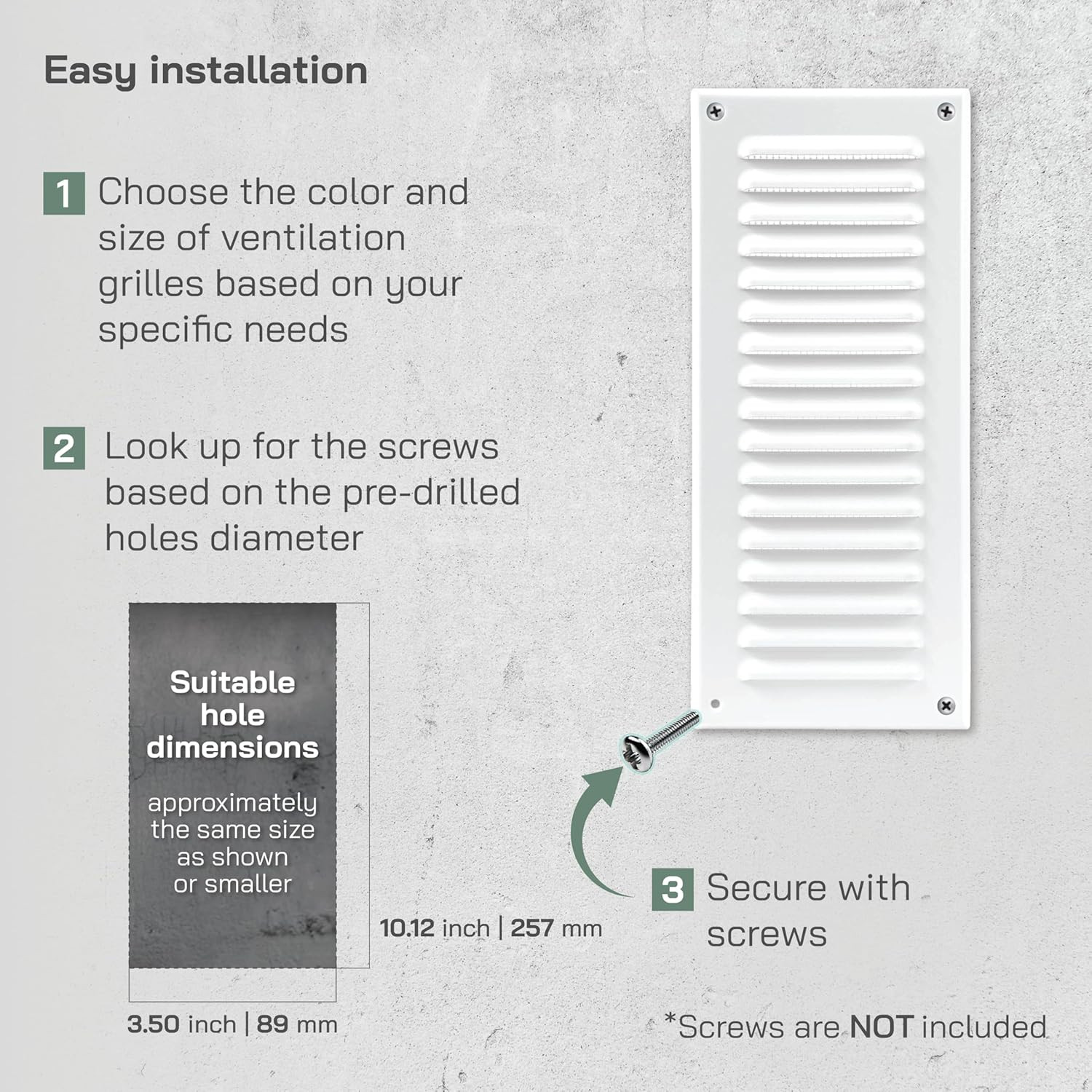 A szellőzési fedél telepítése rendkívül egyszerű és gyors. Először jelölje meg a csavarlukak helyét a falra vagy mennyezetre (140 x 271 mm távolságban). Fúrjon lyukakat a jelölt helyekre, majd helyezze a fedelet a nyílásra. Végül rögzítse a megfelelő méretű csavarokkal. Az egész folyamat mindössze 10-15 percet vesz igénybe, és nem szükséges speciális szerszám vagy szakértelem.
