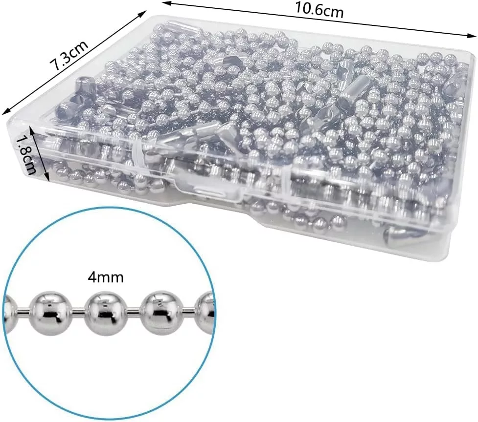 Ovaj visokokvalitetni kuglični lanac od nehrđajućeg čelika savršeno je rješenje za brojne kućanske i kreativne primjene. Duljina od 6 metara i precizno izrađene kuglice od 4 mm jamče trajnost i elegantan izgled. Glatka površina kuglica ugodna je na dodir, dok materijal od nehrđajućeg čelika osigurava dugi vijek trajanja i otpornost na koroziju.