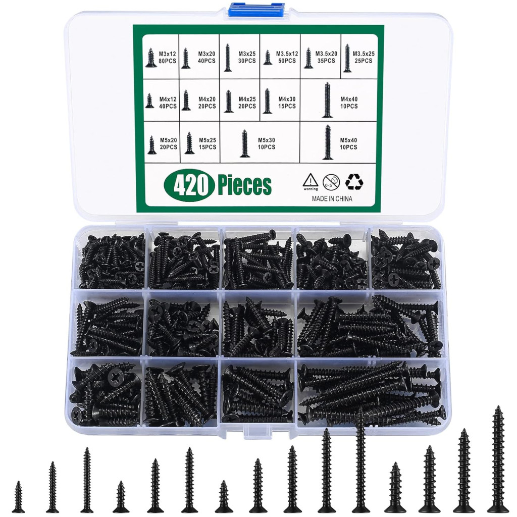A szett három fő méretcsaládot tartalmaz: M3, M3.5 és M4, valamint M5 csavarokat, különféle hosszúságokkal (12 mm-től 40 mm-ig). Ez biztosítja, hogy szinte minden projekt számára megtalálja a megfelelő csavart. A teljes készlet 420 darabból áll, amely az alábbi összetételből áll: