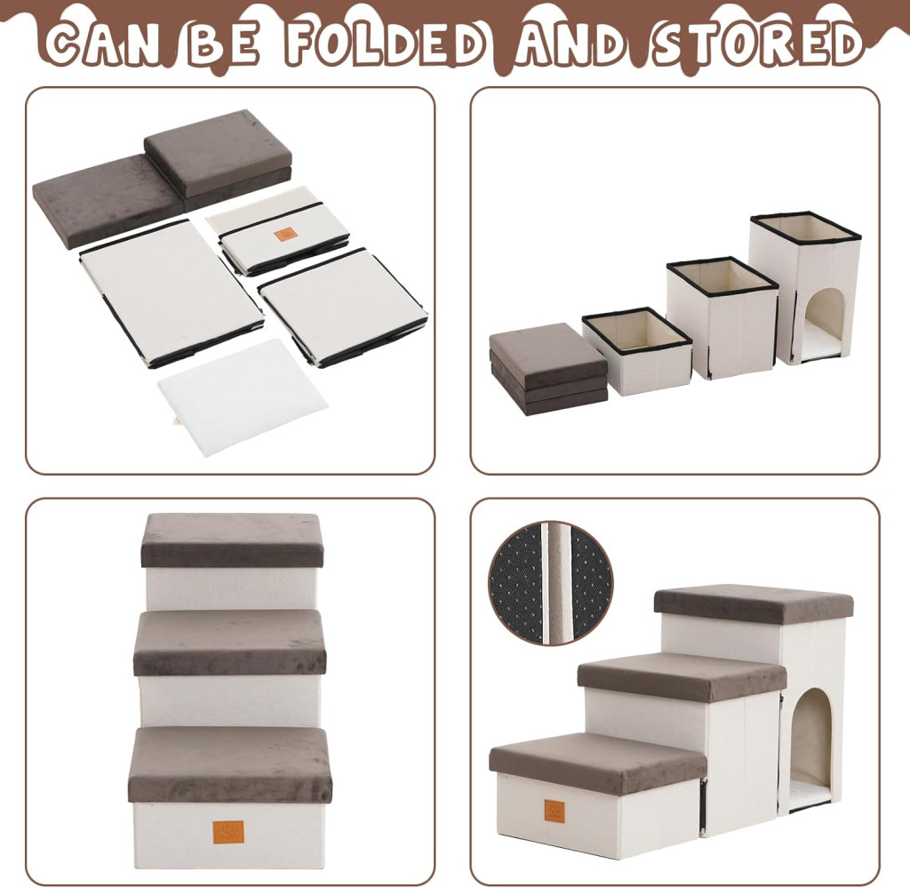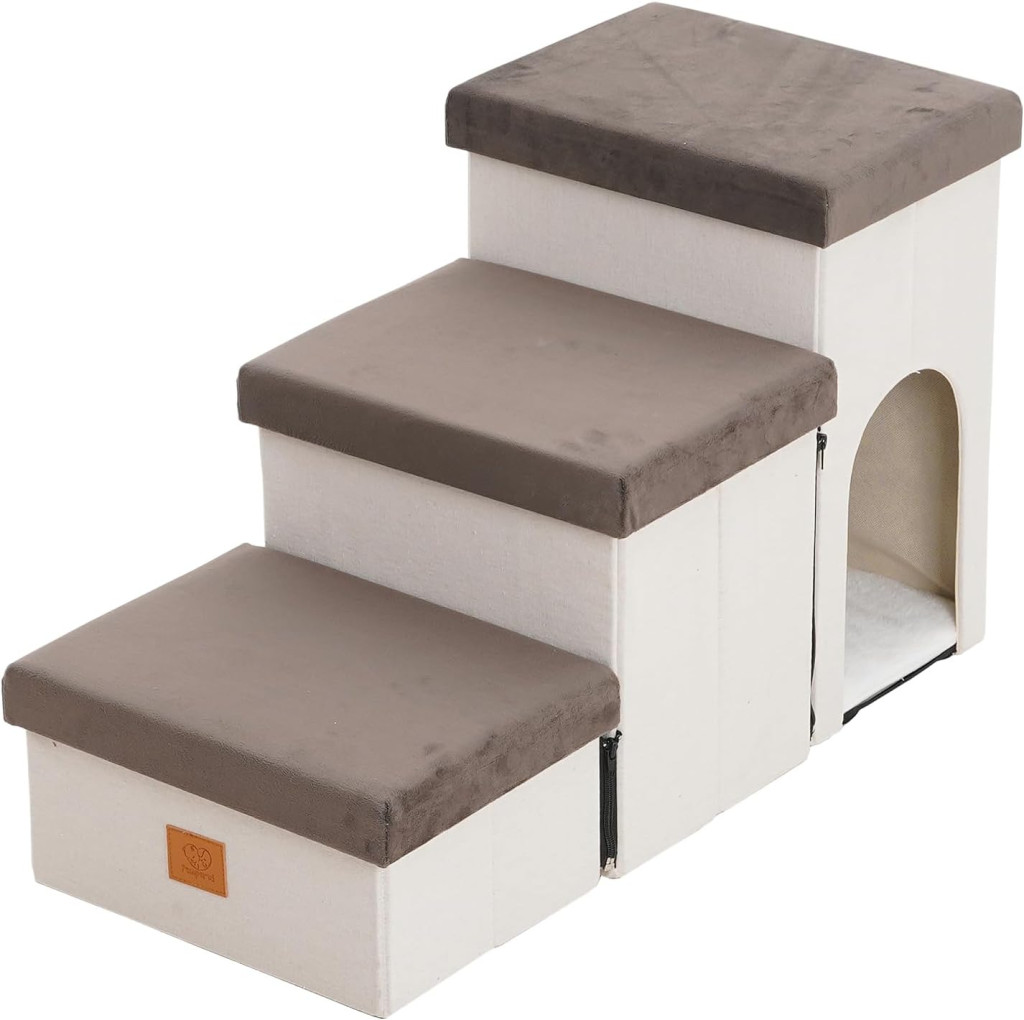 Az Arkyomi 3 lépcsős kutyalépcsők a tökéletes megoldás kis kutyák, macskák és idős háziállatok számára. Ez a gondosan tervezett lépcsőrendszer 44 cm magas, és beépített tárolóhellyel rendelkezik, amely praktikus és stílusos kiegészítést jelent otthonához. A bézs szín minden lakberendezéshez harmonikusan illeszkedik, míg a magas sűrűségű habszivacs és a speciális háziállat-szövet biztosítja a maximális kényelmet és biztonságot.