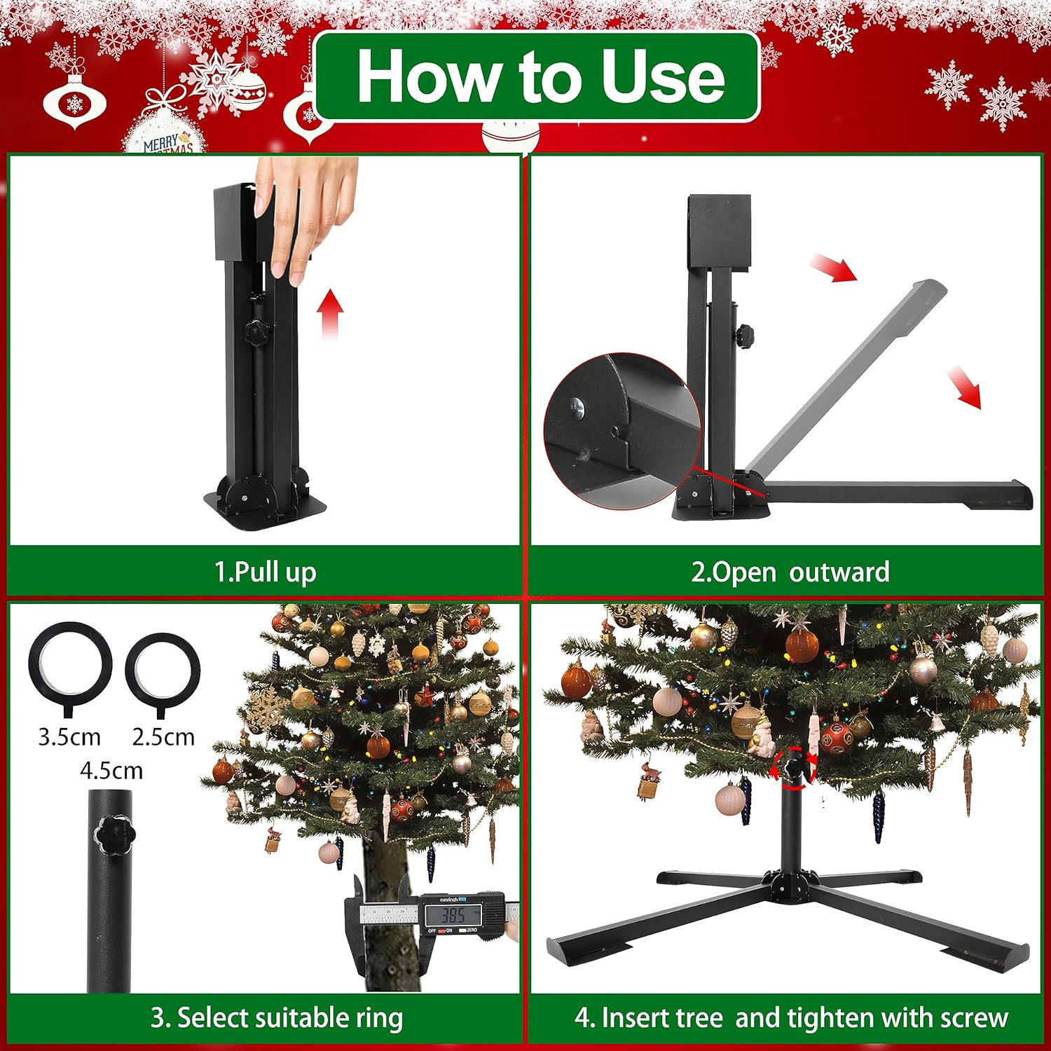 Kompatibilitás: Az állvány 60 cm-től 280 cm magasságig terjedő mesterséges karácsonyfa számára alkalmas. A 3 adapter gyűrű biztosítja, hogy 2 cm-től 4,5 cm-ig terjedő törzs átmérőjű fák is biztonságosan rögzíthetők.