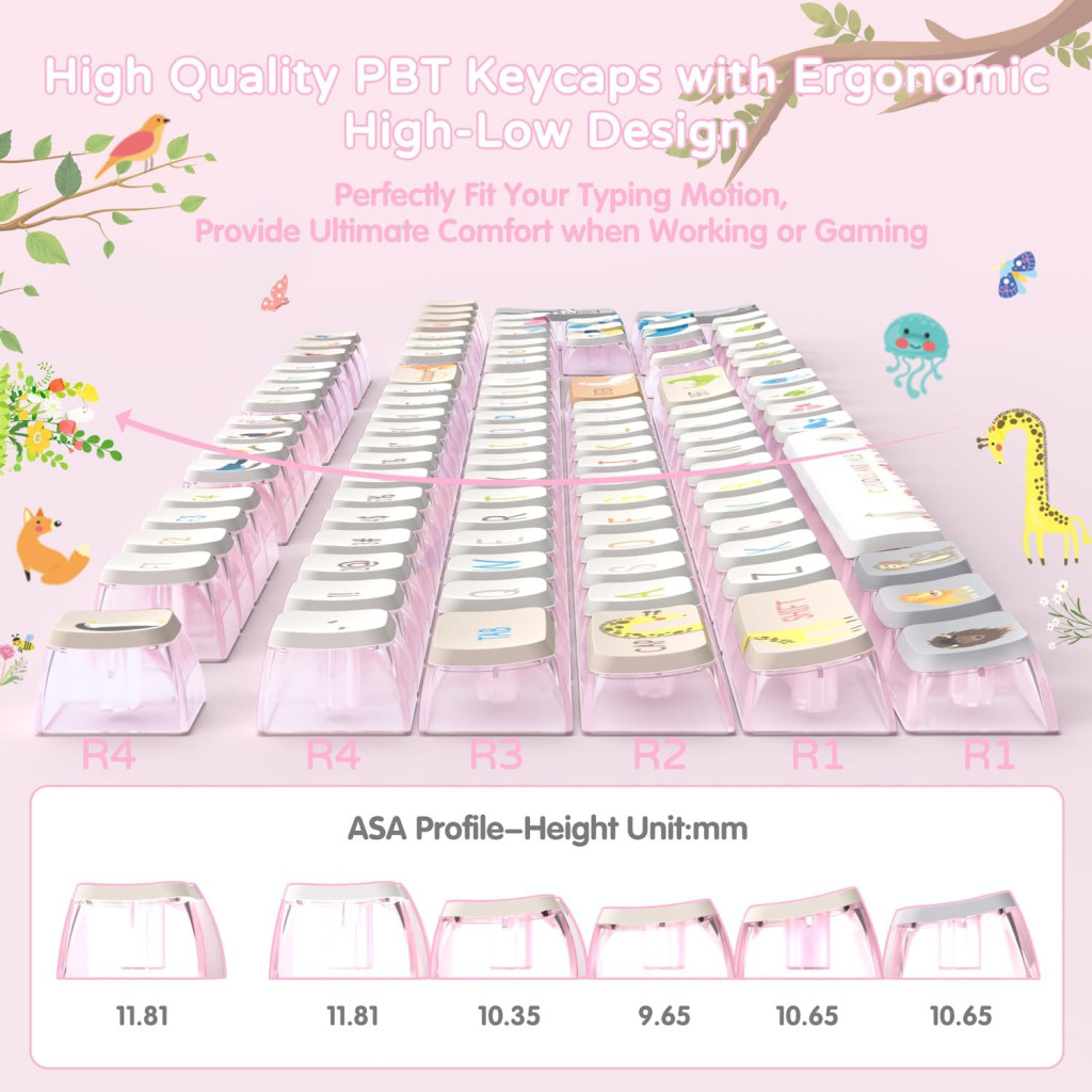 - PBT Festékszublimációs Technológia: A keycapok felső része magas minőségű PBT anyagból készült. A kettős injekciós formázás és festékszublimációs technológia biztosítja, hogy a minták, karakterek és élénk színek nem halványulnak el az idő múlásával. Nem lesz zsíros vagy fényes megjelenésű még intenzív használat után sem.