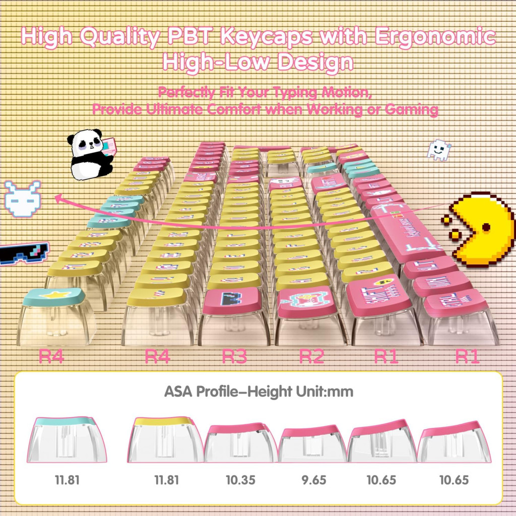 Az ASA profil biztosítja az ergonomikus és kényelmes gépelési élményt, amely ötvözi az OEM profil magasságát a klasszikus SA profil gömbös tetejével. Ez a kombináció ideális választás hosszú gépelési munkamenetekhez és intenzív játékhoz egyaránt.