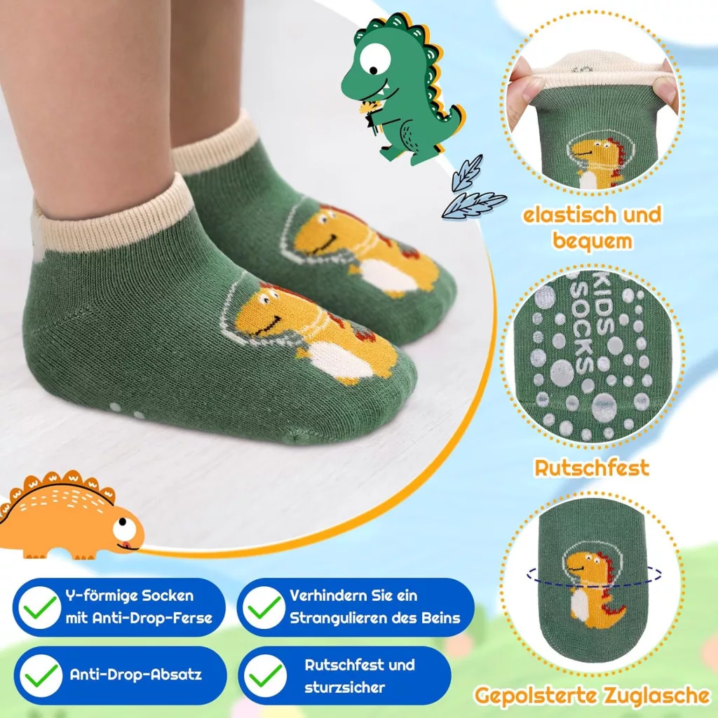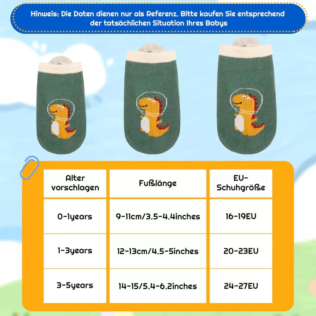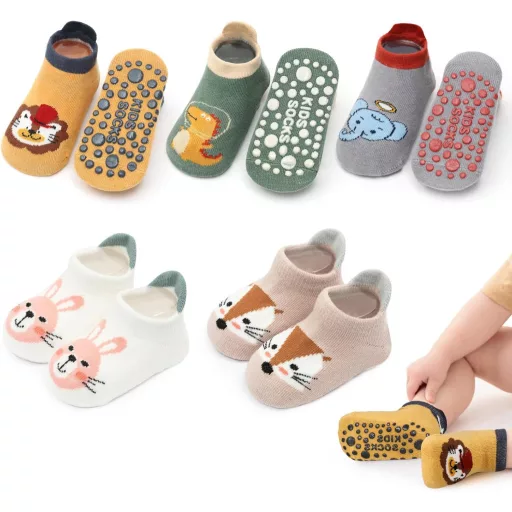 Ove pažljivo izrađene protuklizne dječje čarape idealan su izbor za sve roditelje koji traže kvalitetu i udobnost. Proizvod sadrži pet pari čarapa ukrašenih slatkim motivima crtanih životinja, koje su savršene za cijelu godinu. Mješavina mekanog pamuka osigurava maksimalnu udobnost i prozračnost, dok protuklizni potplat jamči sigurnost kada mališani uče hodati ili se igraju.