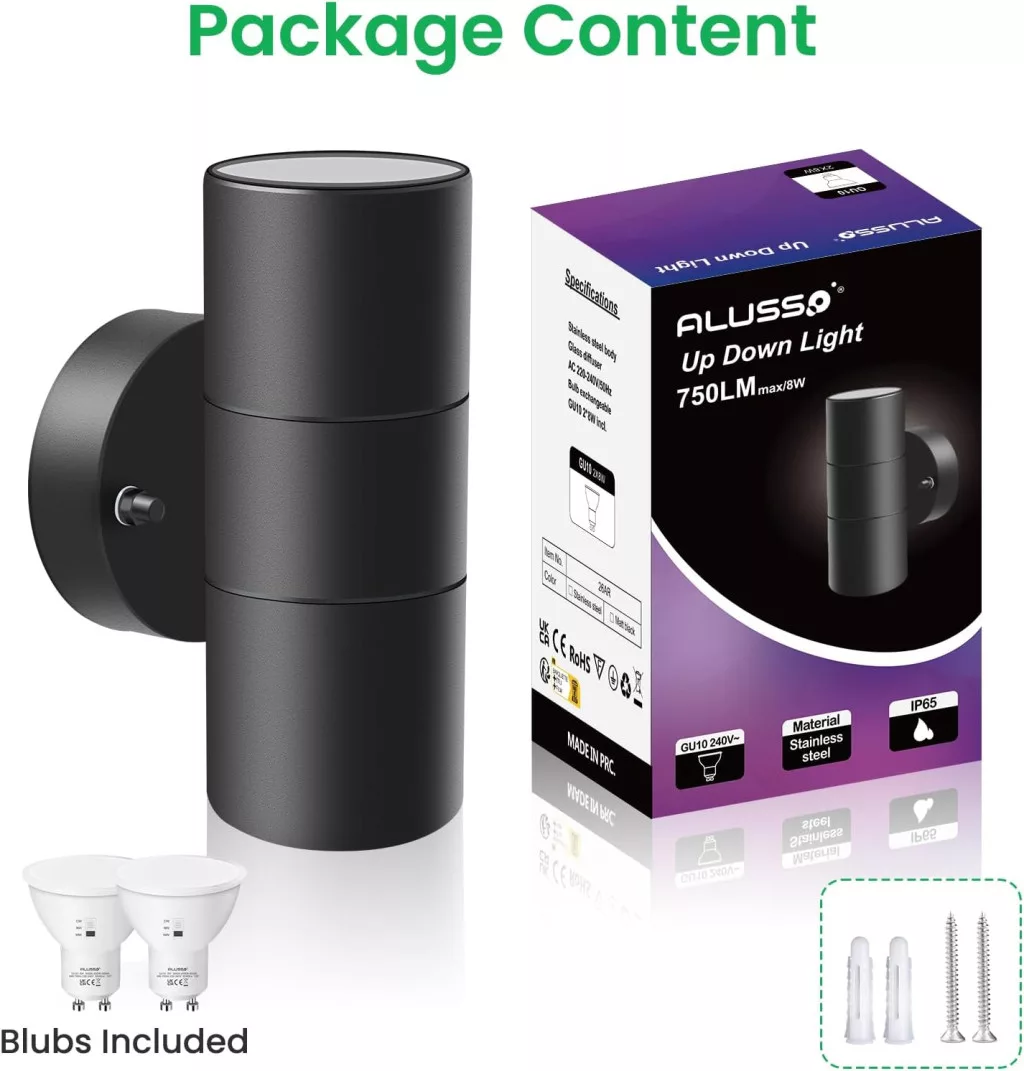 Sve u svemu, ALUSSO LIGHTING LED zidna svjetiljka je izvrsna investicija za one koji traže dugotrajno, energetski učinkovito i stilsko rješenje za osvjetljenje. Kompletan paket, koji uključuje 2 GU10 žarulje i materijal za montažu, spreman je za trenutnu upotrebu.