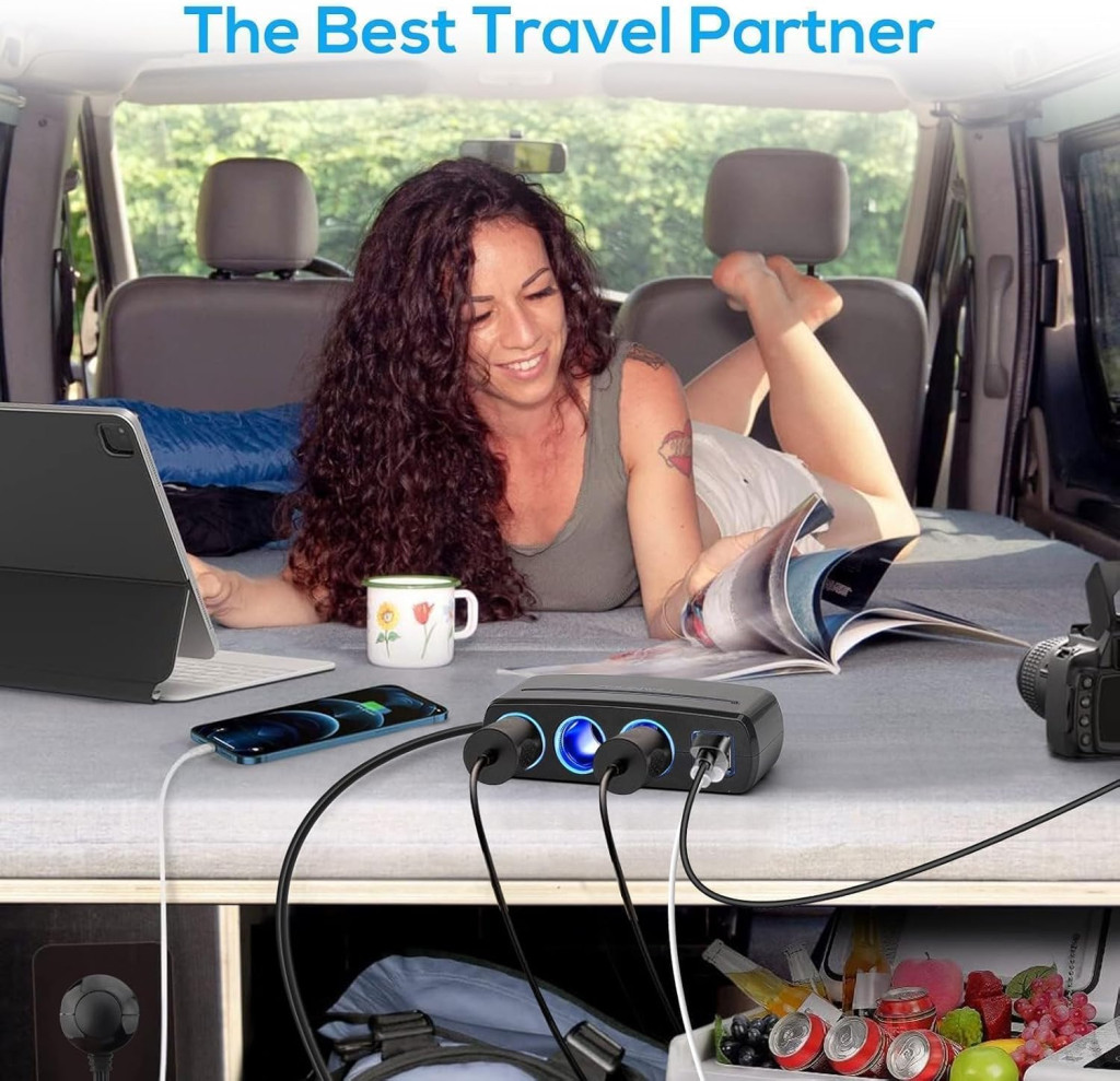 - 3 Utičnice za Upaljač: Svaka snage 80W, ukupno 120W. Istovremeno možete pokretati više uređaja, poput kamere za snimanje vožnje, ventilatora, navigacijskog sustava ili pročišćivača zraka.