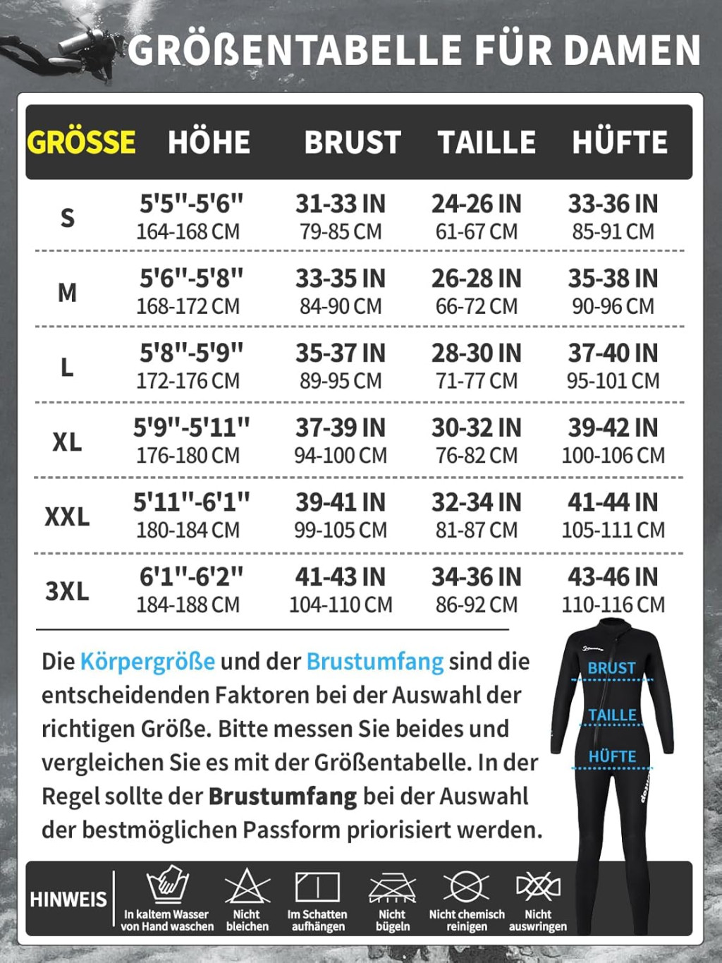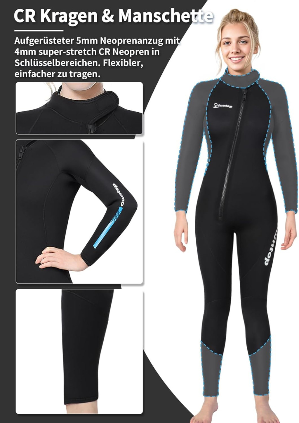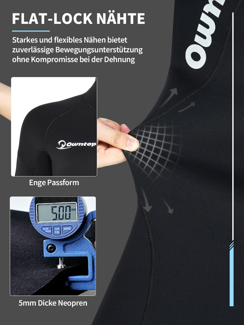 Owntop ronilačko odijelo je unisex dizajna, tako da savršeno pristaje i muškoj i ženskoj građi tijela. Tijekom odabira veličine potrebno je uzeti u obzir dva važna faktora: tjelesnu težinu i visinu. Proizvod je dostupan od veličine S do veličine XL, tako da svatko može pronaći odgovarajuću veličinu.