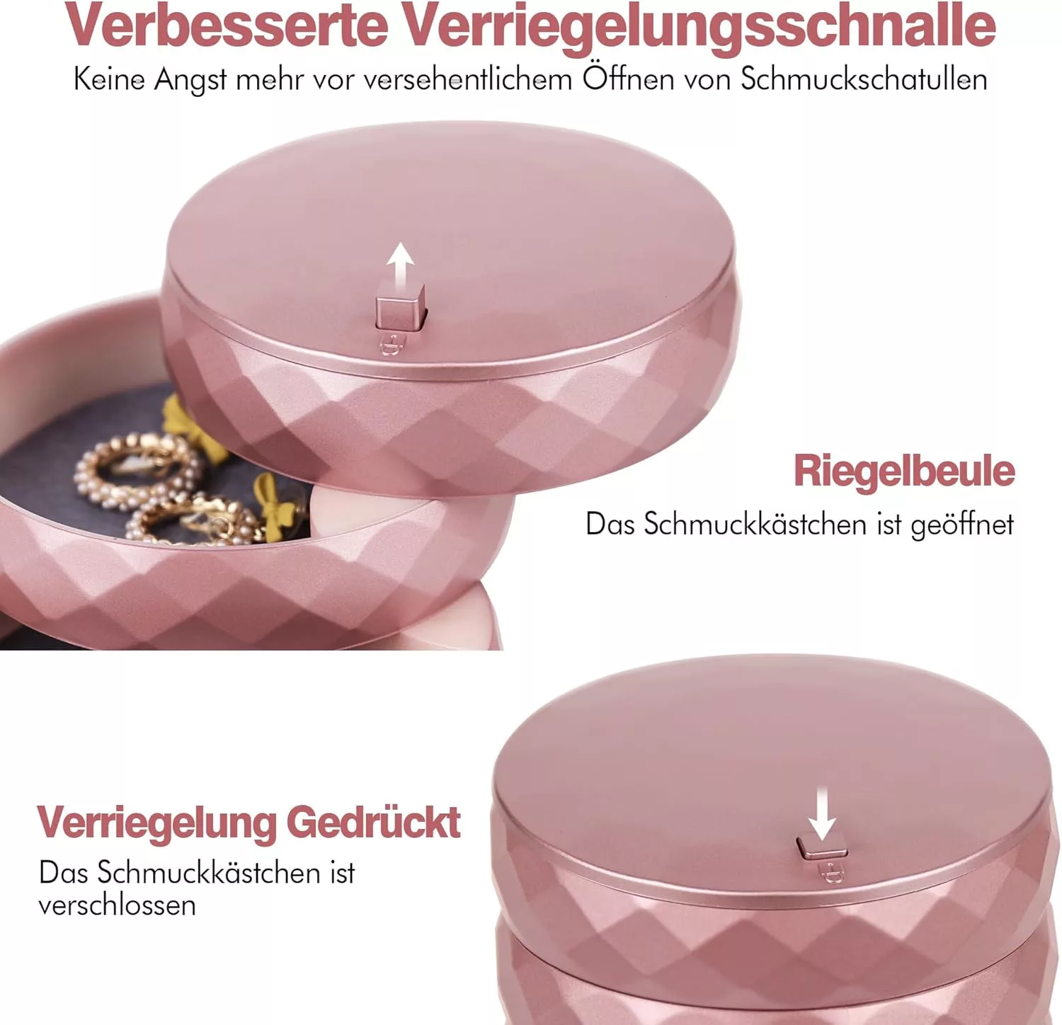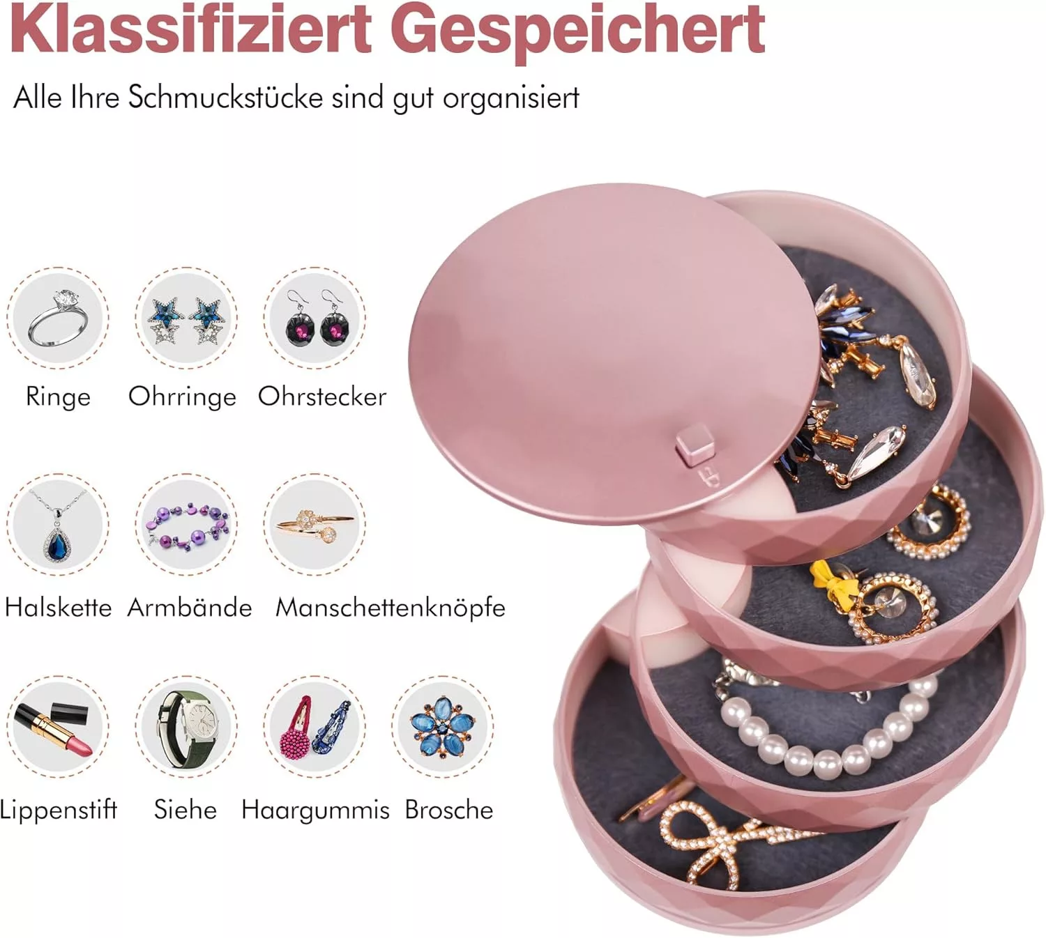 INMORVEN kutija za nakit savršena je kombinacija modernog stila i praktične funkcionalnosti. Ova elegantna kutija za pohranu u boji ružičastog zlata posebno je dizajnirana da drži sav vaš nakit organiziranim na jednom mjestu. Rotirajući mehanizam omogućuje vam jednostavan pristup bilo kojem komadu nakita bez pretraživanja cijele kutije.