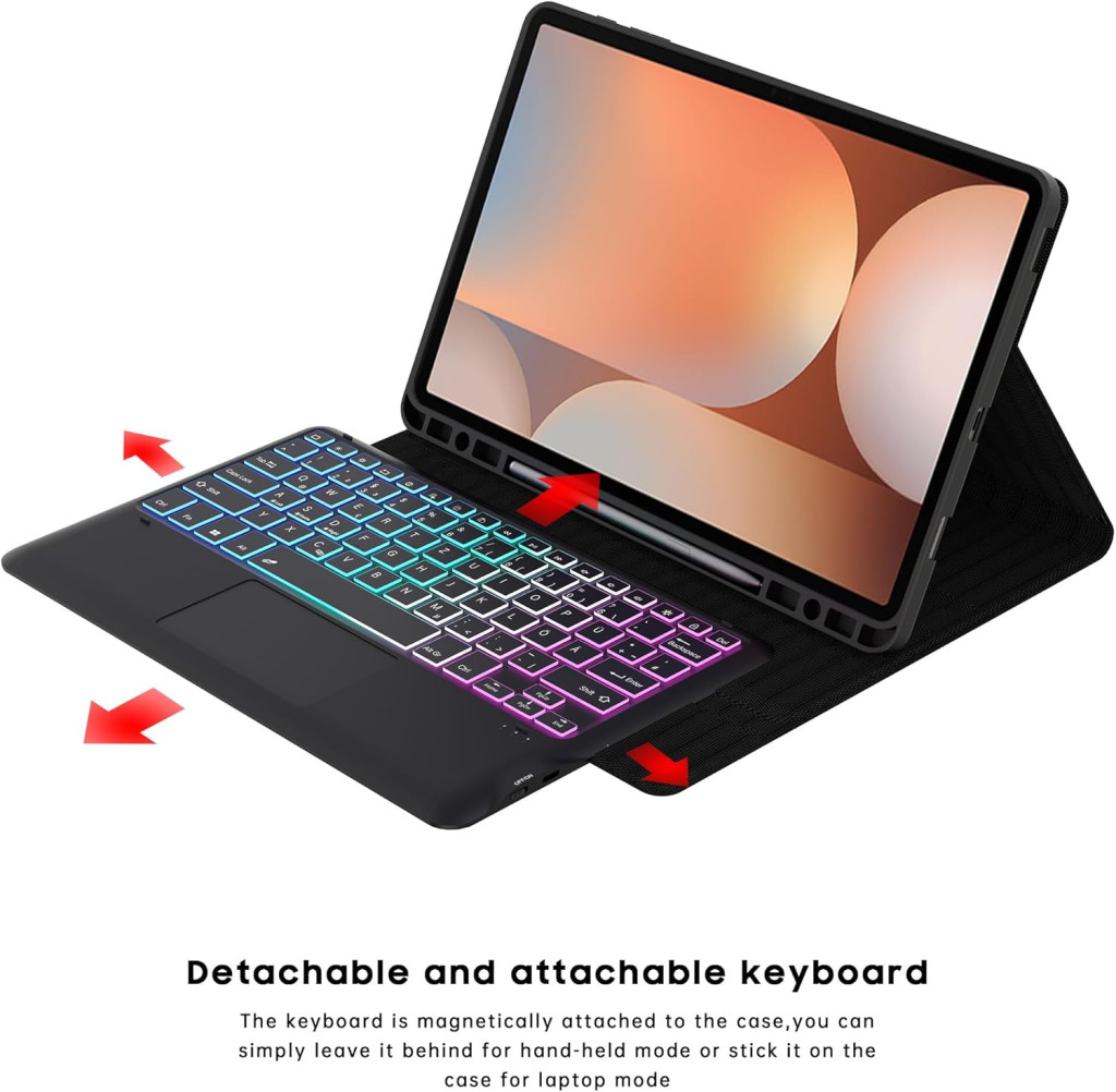 Premium kućište s tipkovnicom dizajnirano za Samsung Galaxy Tab S9+, S9 FE+ i S10+ 12.4 inčne tablete nudi kompletno rješenje radne stanice. Ovaj inovativni dodatak kombinira prenosivost tableta s produktivnošću nalik prijenosnom računalu, opremljen sa 7 boja LED pozadinskog osvjetljenja i profesionalnom QWERTZ tipkovnicom. Odvojiva bežična tipkovnica i integrirani touchpad omogućuju vam da u trenu transformirate svoj tablet u potpuno funkcionalan radni alat.