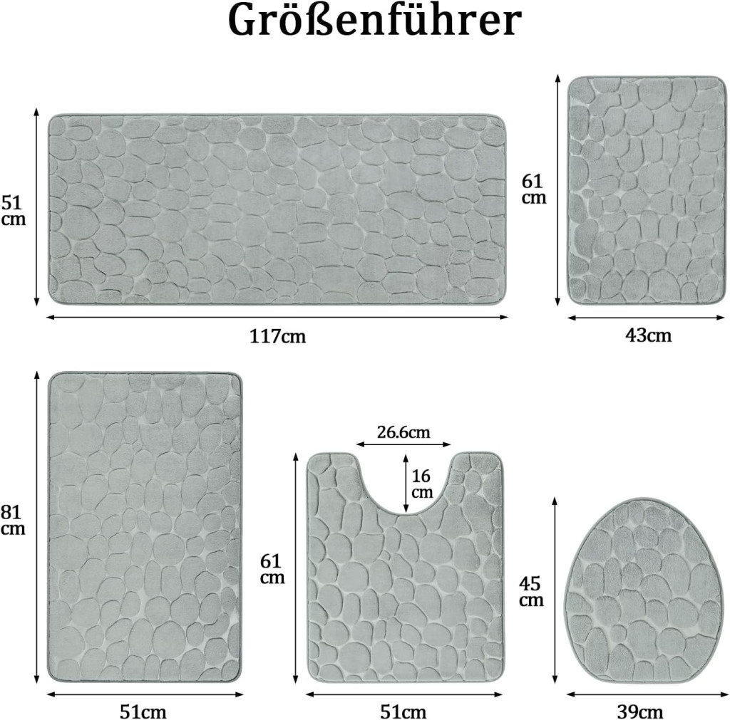 Chakme Memory Foam Set Kupaonskih Otirača 5 Dijelova - Uzorak Oblutaka, Protuklizni, Upijajući, Perivi Kupaonski Tepisi, Svijetlosivi