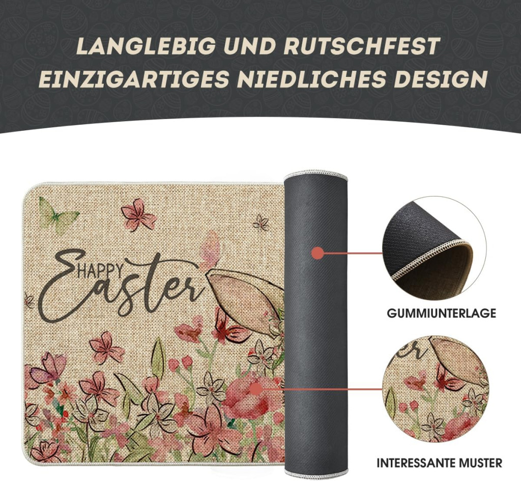 Az Artoid Mode Virágos Nyuszik Húsvéti Lábtörlő egy elegáns és praktikus megoldás otthona bejáratához. Ez a 40 x 60 cm-es szőnyeg tökéletes választás azok számára, akik szeretnék meleg és barátságos légkört teremteni otthonukban. A virágos minta és a nyuszik motívuma különösen alkalmas a húsvéti dekorációhoz, de egész évben szép kiegészítése lehet lakásának. A termék beltéri és kültéri használatra egyaránt alkalmas, így a bejárat, a hátsó ajtó, a mosókonyha vagy a folyosó dekorációjához is ideális.