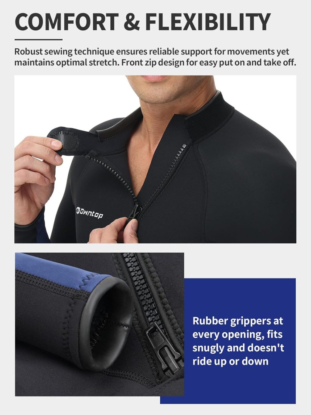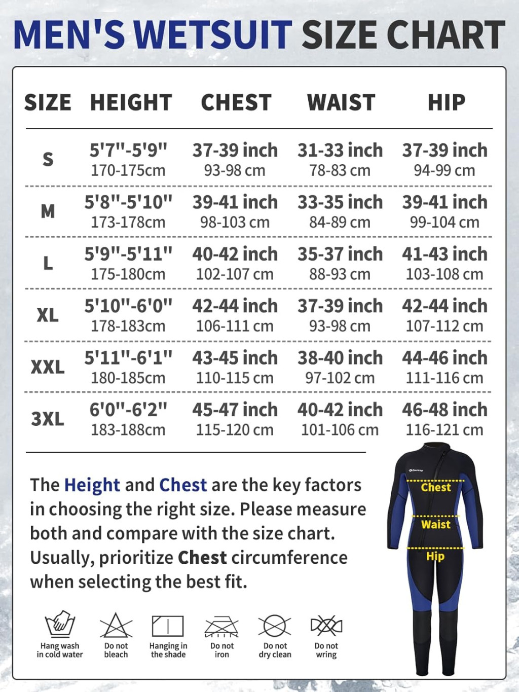 Az Owntop wetsuit uniszex tervezésű, férfiak és nők számára egyaránt alkalmas. A pontos méretezés kulcsfontosságú a megfelelő illeszkedéshez és kényelemhez. Kérjük, gondosan tanulmányozza az Owntop mérettáblázatot a vásárlás előtt. Mérje meg a magasságot, mellkast, derekát és csípőt. Ha két méret között van, válassza a nagyobbat. A neoprén anyag összehajtva szállítódik, így a szállítás során ráncolódások lehetségesek, de ezek nem befolyásolják a használatot és néhány viselés után eltűnnek.