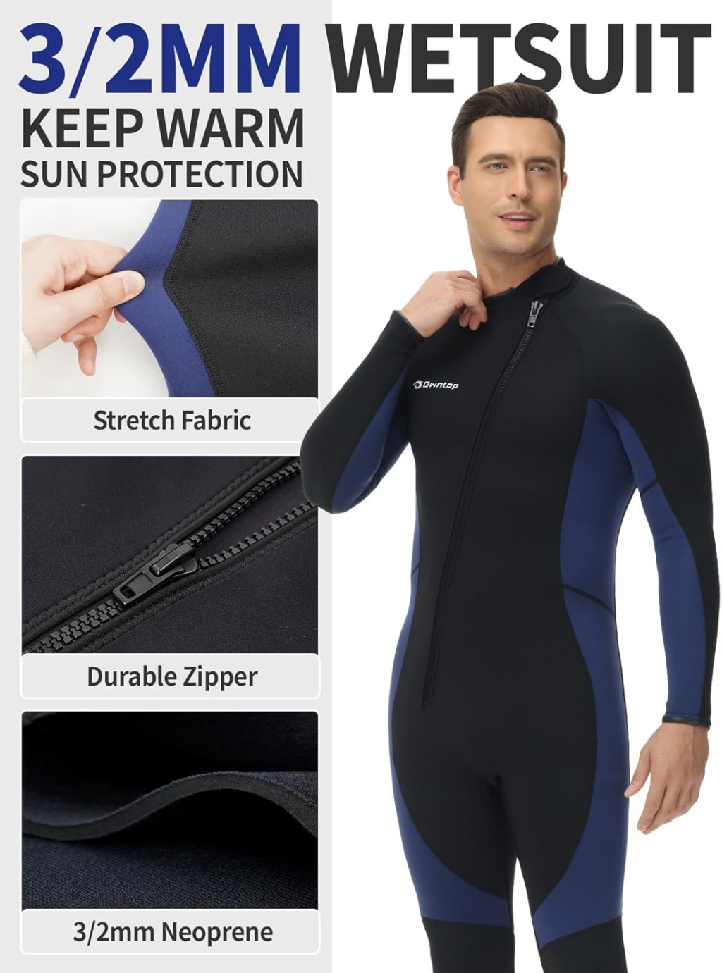 Owntop 3/2 mm neoprén wetsuit elöl cipzárral, nyújtható búvárkodási ruha férfiaknak és nőknek