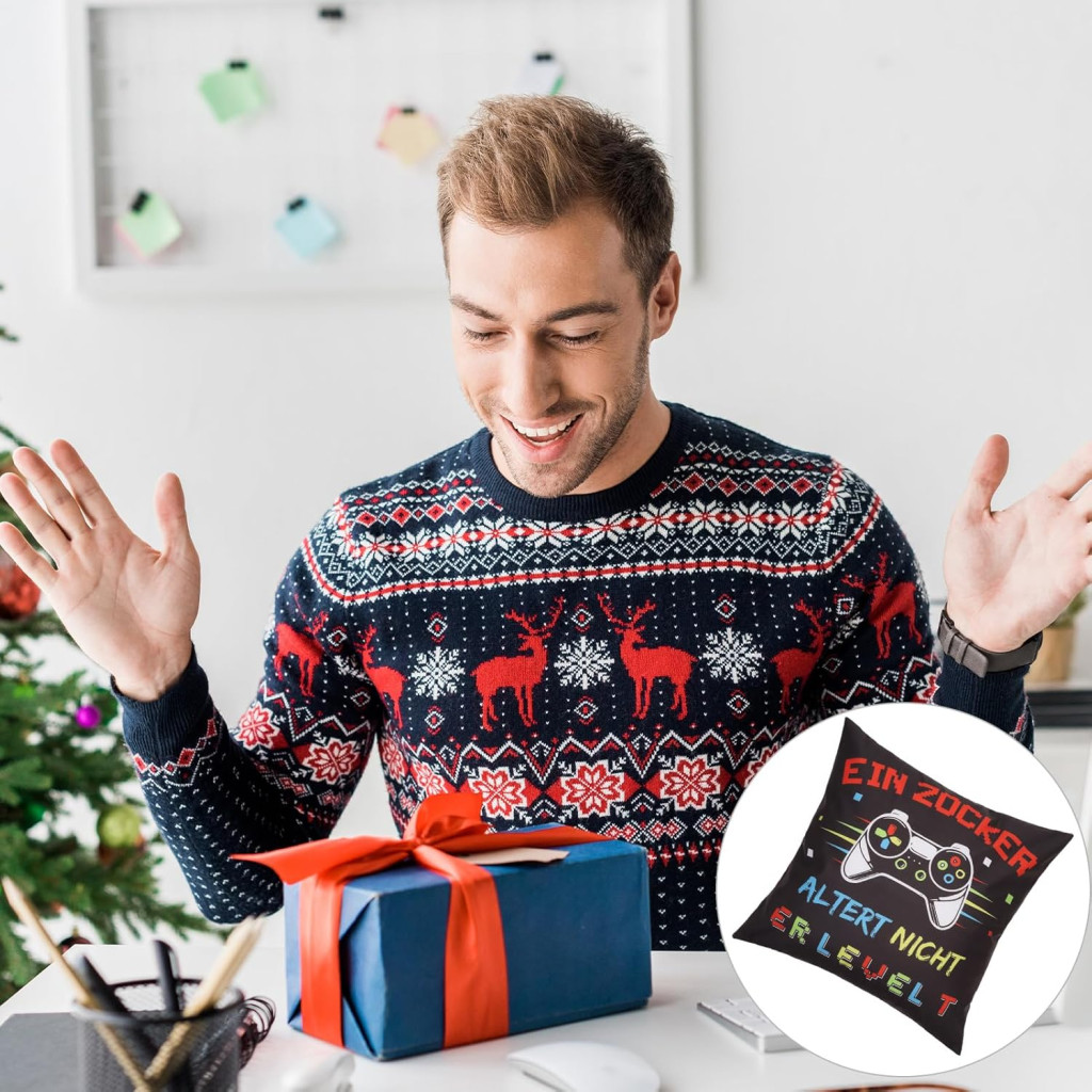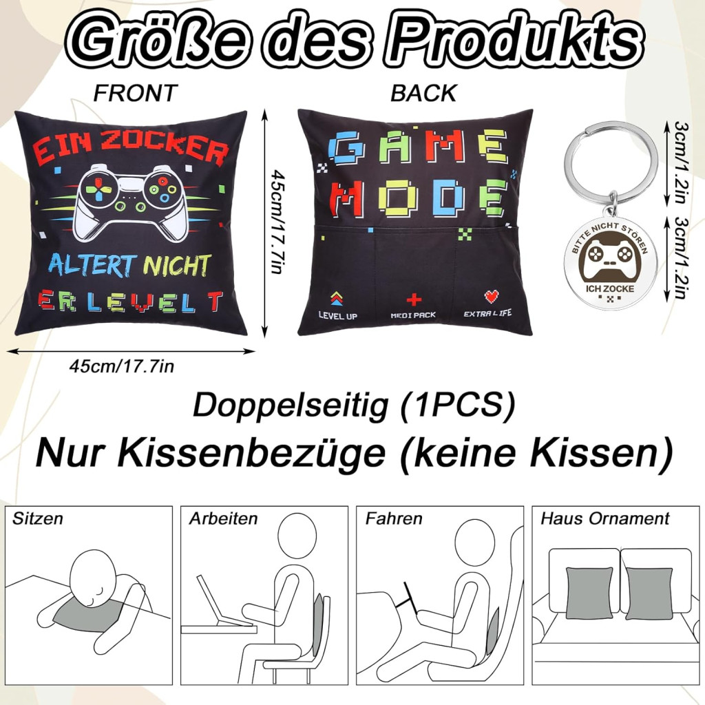 Ova originalna dekorativna jastučnica dimenzija 45 x 45 cm savršen je izbor za sve gamere i ljubitelje videoigara. S uzorkom s obje strane i zabavnim tekstom ("Ein Zocker altert nicht. He levels.") ovaj jastuk zajamčeno će izmamiti osmijeh na lice. Izrađen je od visokokvalitetnog poliesterskog materijala koji je mekan, izdržljiv i jednostavan za čišćenje. Paket također uključuje praktičan privjesak za ključeve.